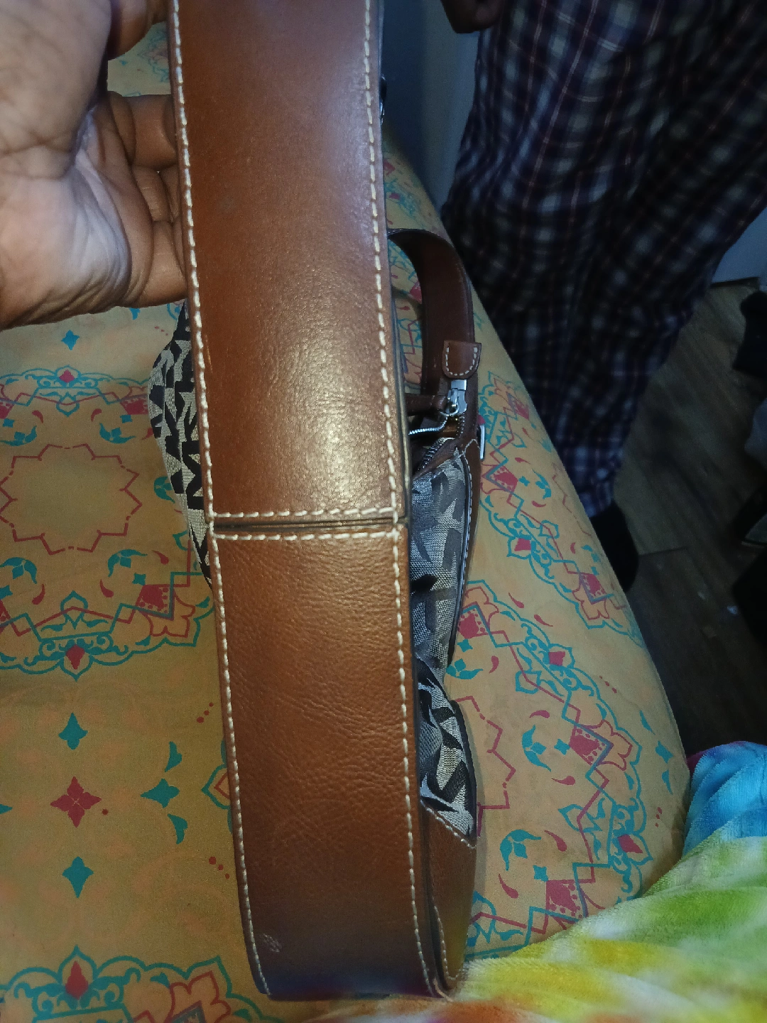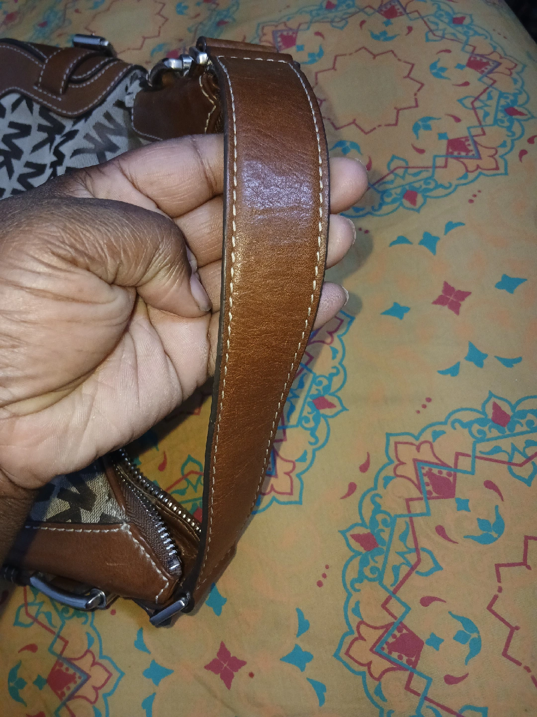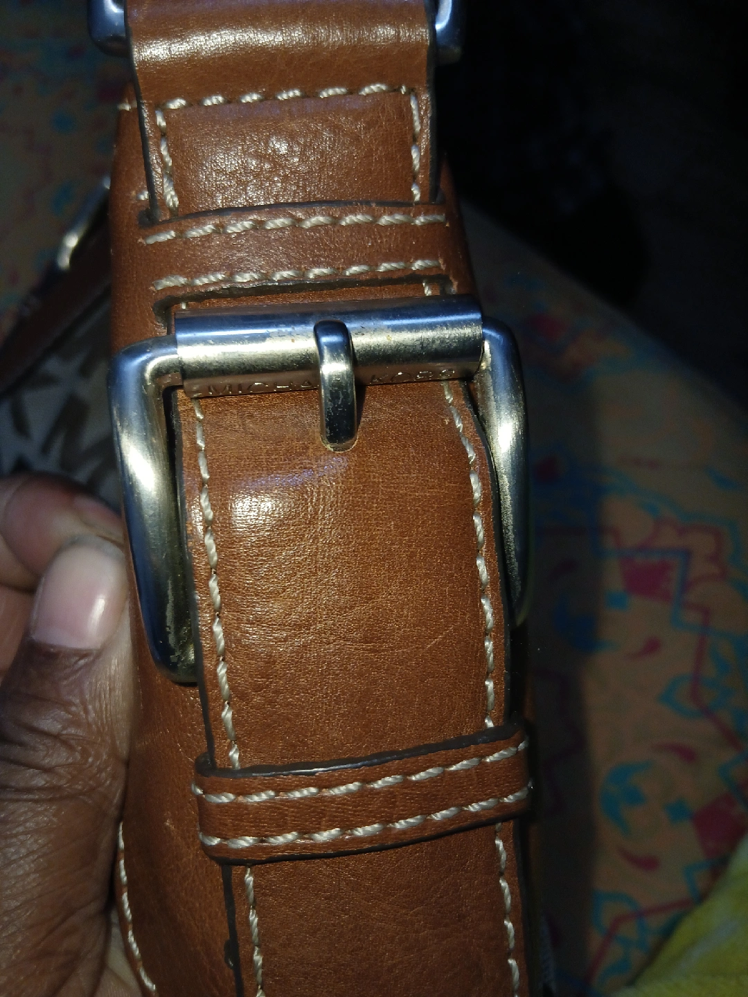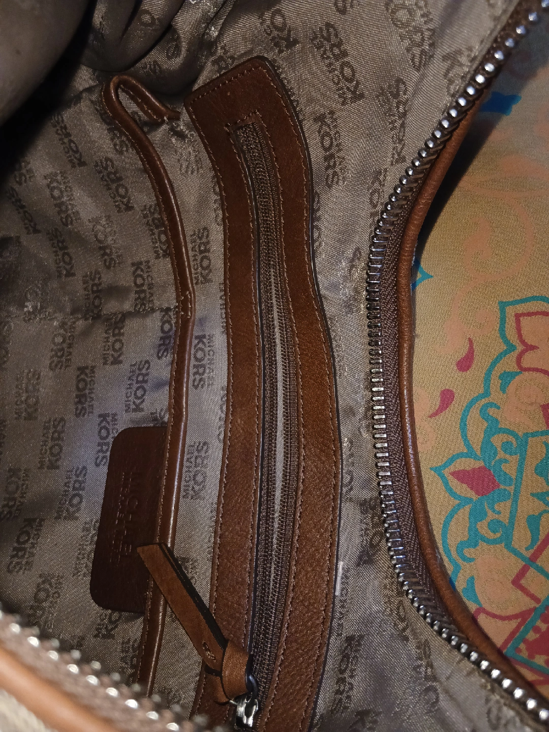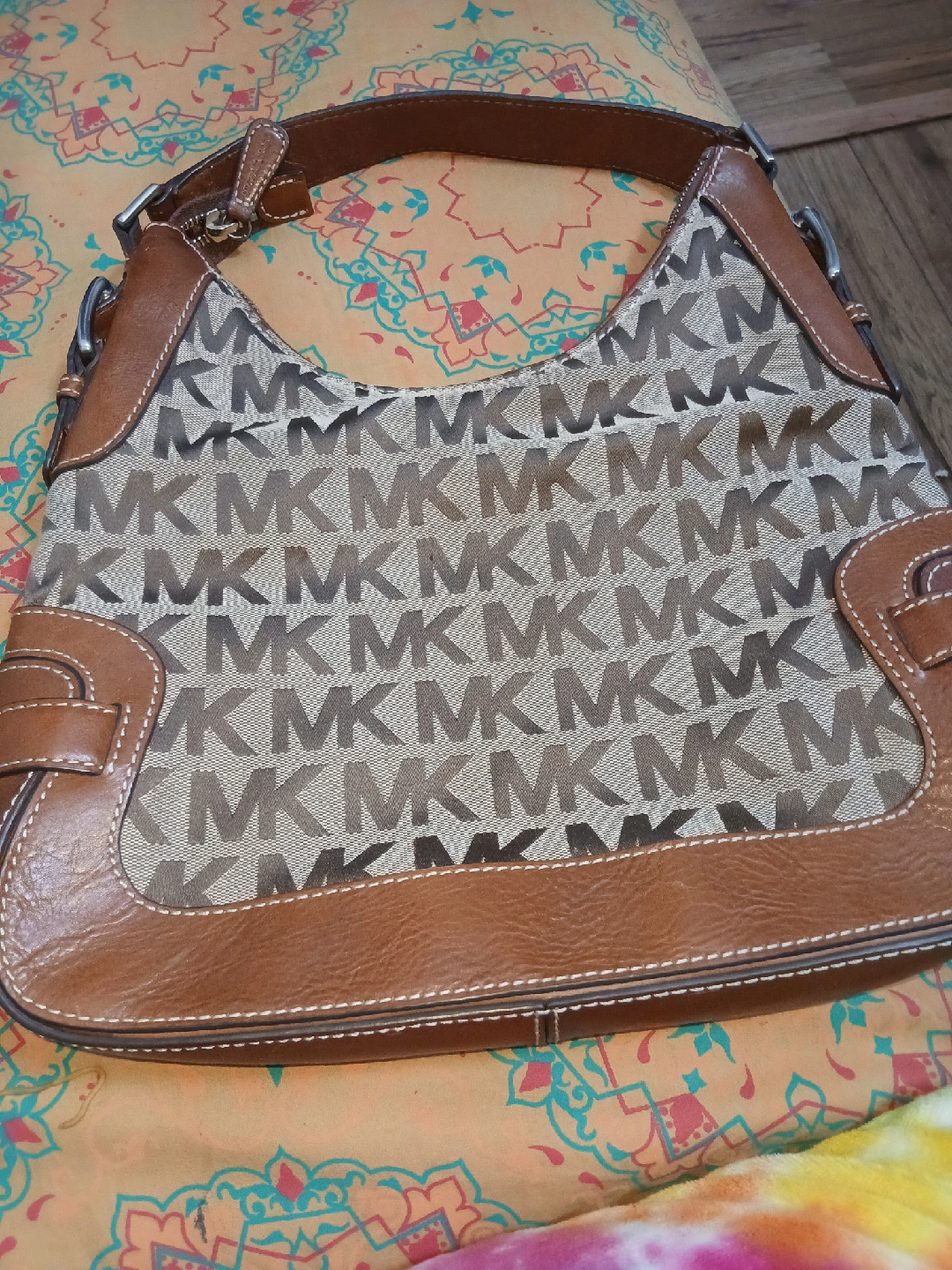 Selling a Michael Kors hobo bag in brown. It features the MK logo pattern throughout the bag. It has leather trim and silver hardware.