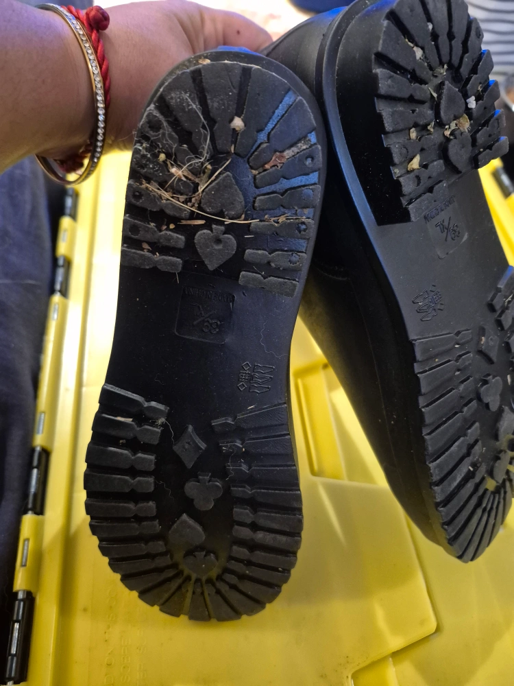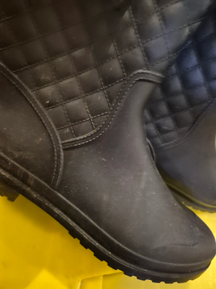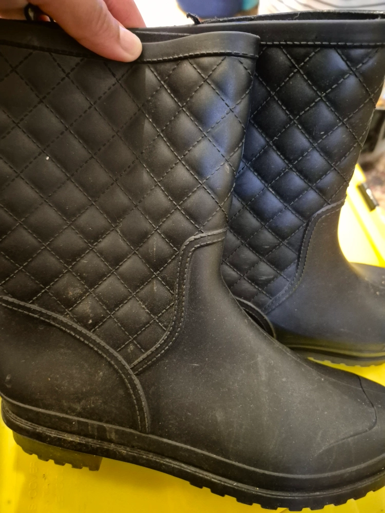 Selling a pair of black rain boots with a quilted design. They are size 7.5 and are in used condition. Please see photos for details! i needed an 8. rainboots ready ⭐️ .. just a touch up on these boots will be perfect. in really good condition but i wore them with rain and debris is stuck to bottom price is low so makes up for the clean up i would use them more. but i am an 8.