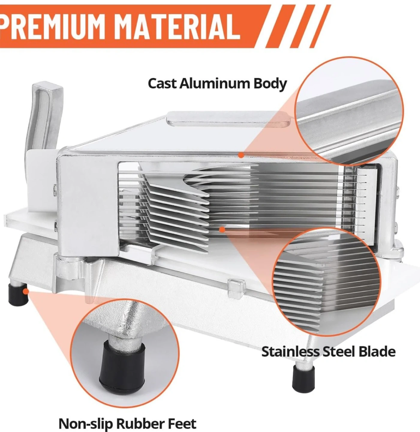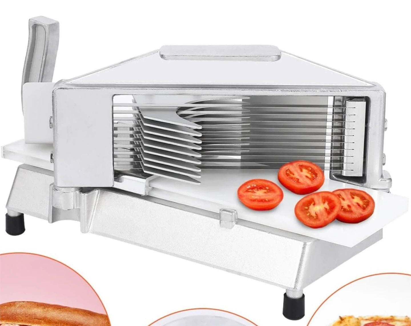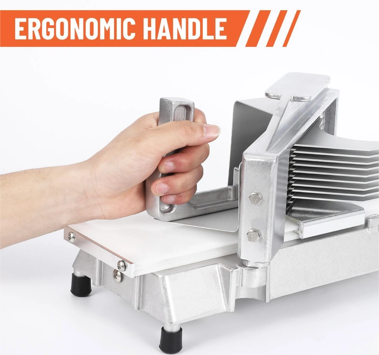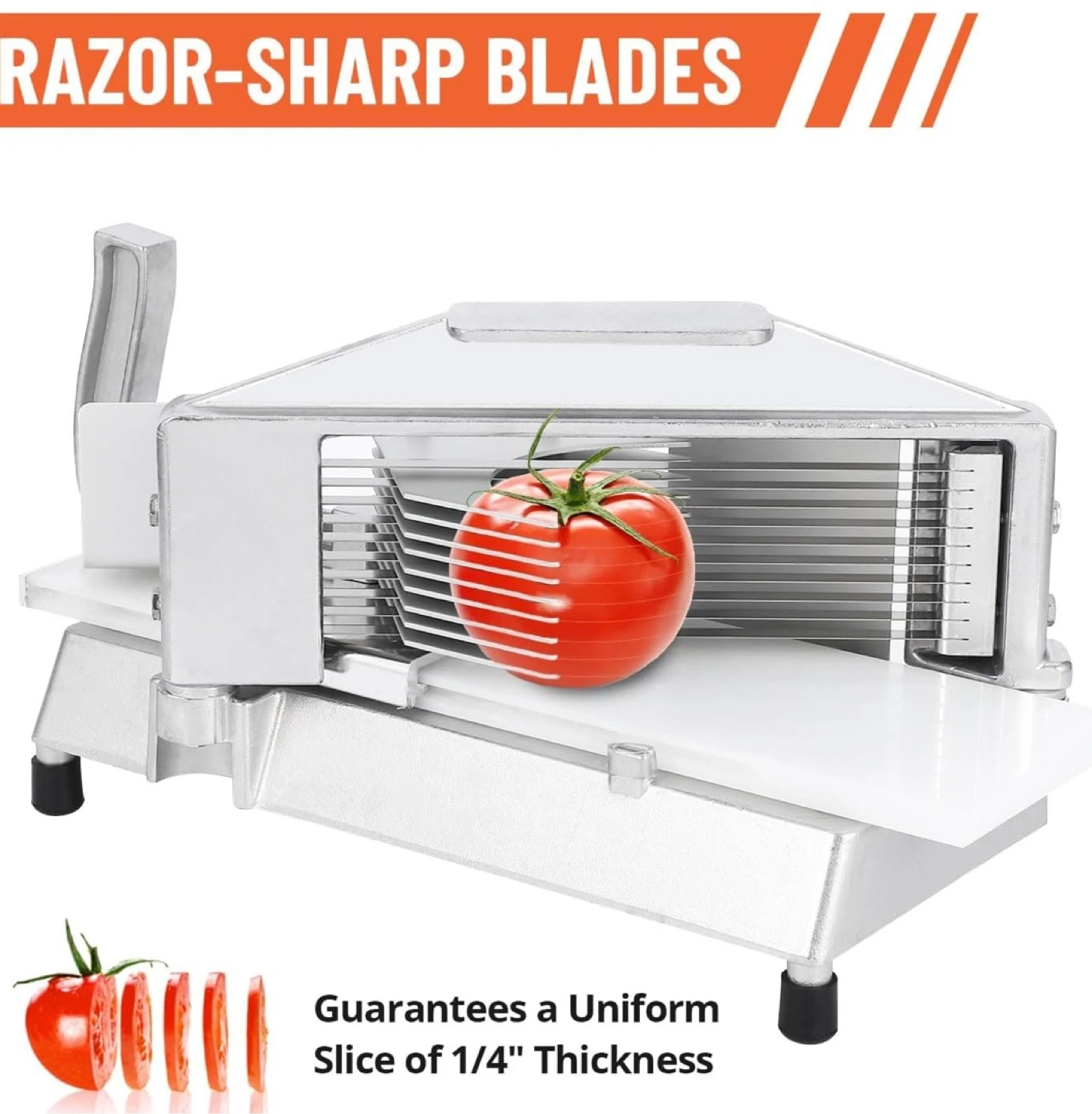 This tomato slicer features a cast aluminum body and stainless steel blades. It also has non-slip rubber feet and protective hand guards. It also has an ergonomic handle for easy use One set of blades free