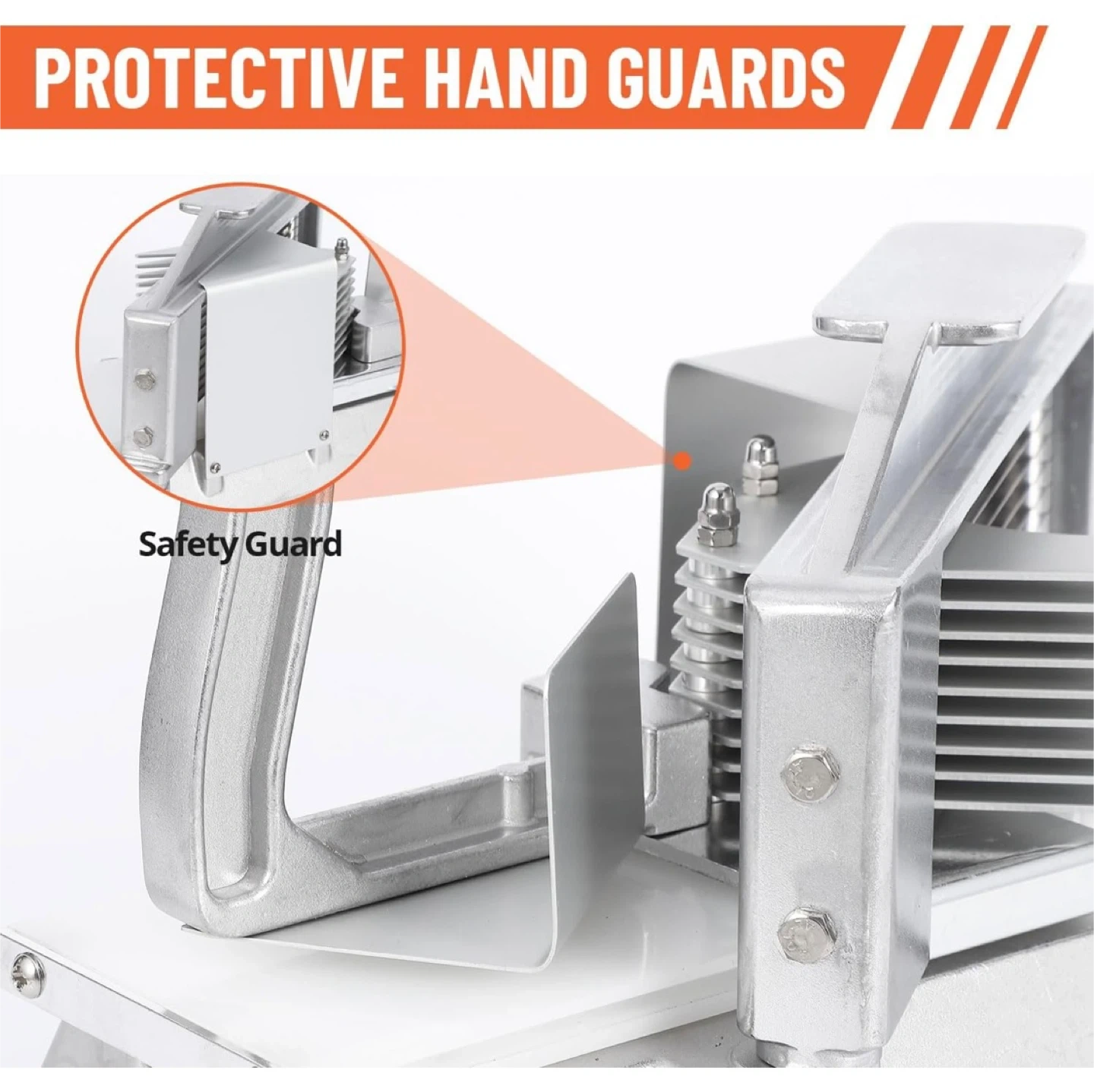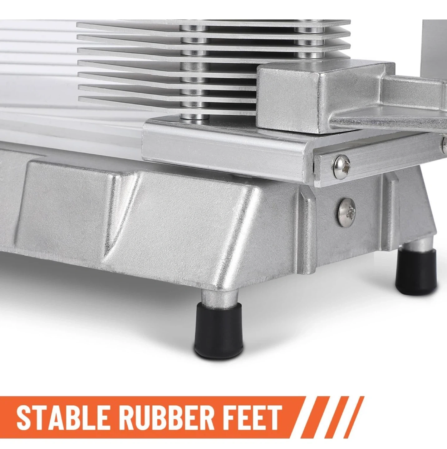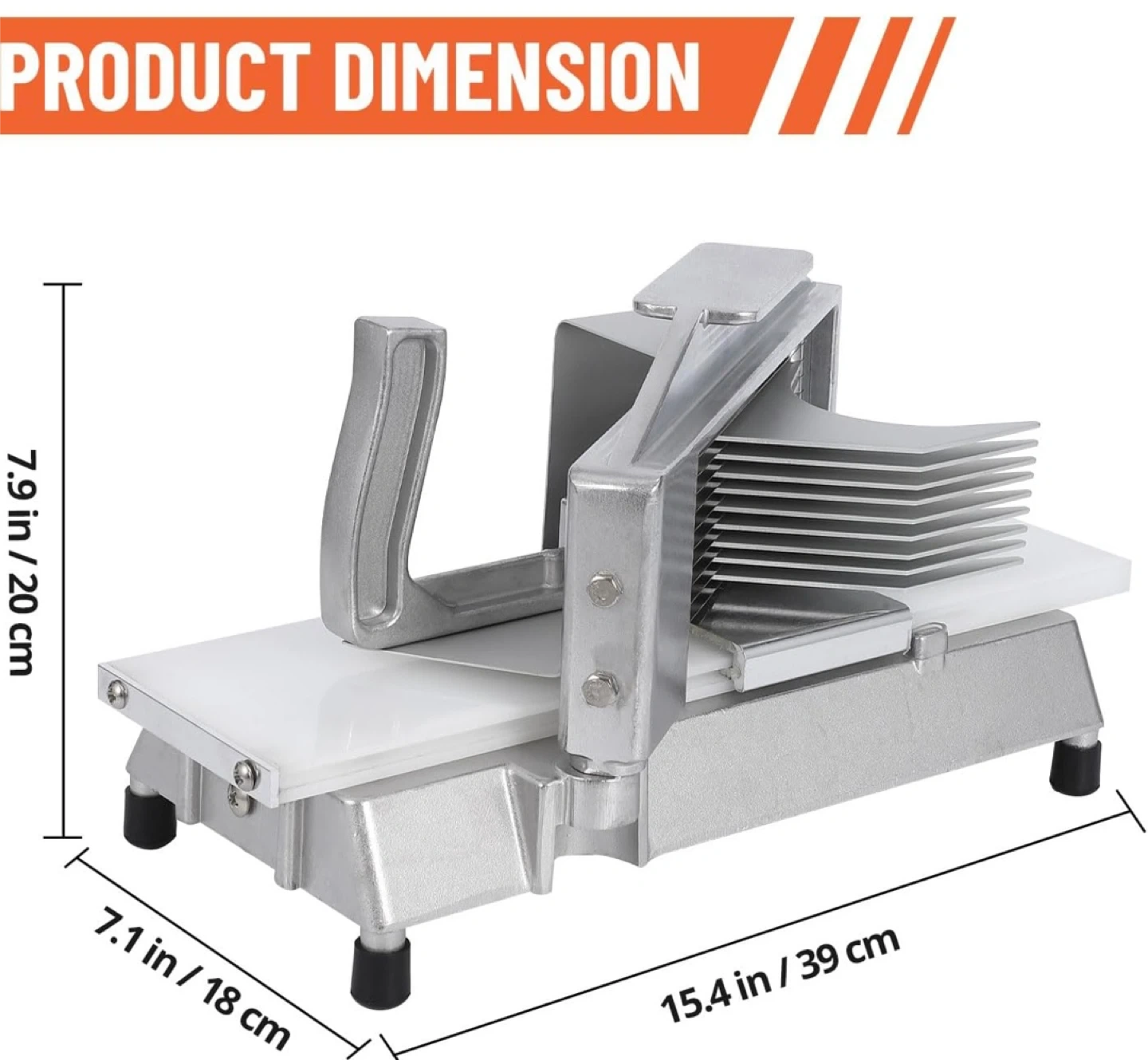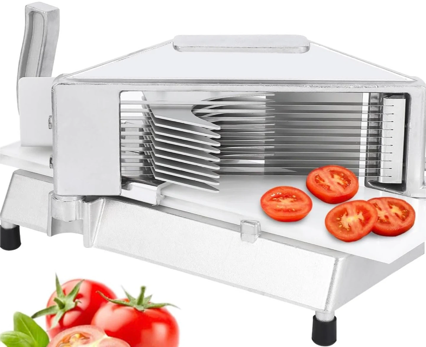This tomato slicer features a cast aluminum body and stainless steel blades. It also has non-slip rubber feet and protective hand guards. It also has an ergonomic handle for easy use One set of blades free