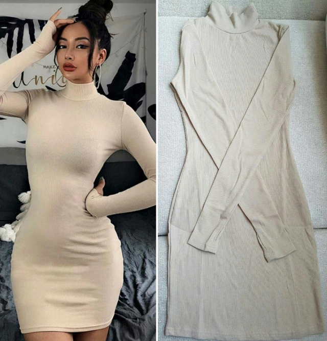 Brand New! Womens Beige Sweater Dress with thumb holes Size S/M Nice quality! Stretchy ribbed material Located in Aurora
