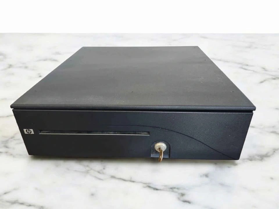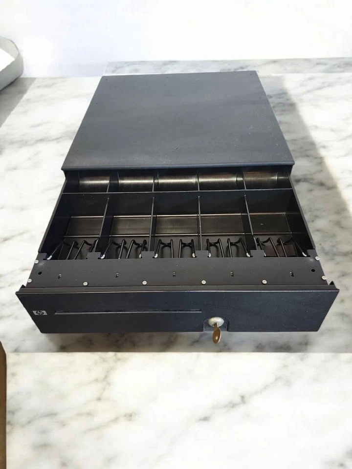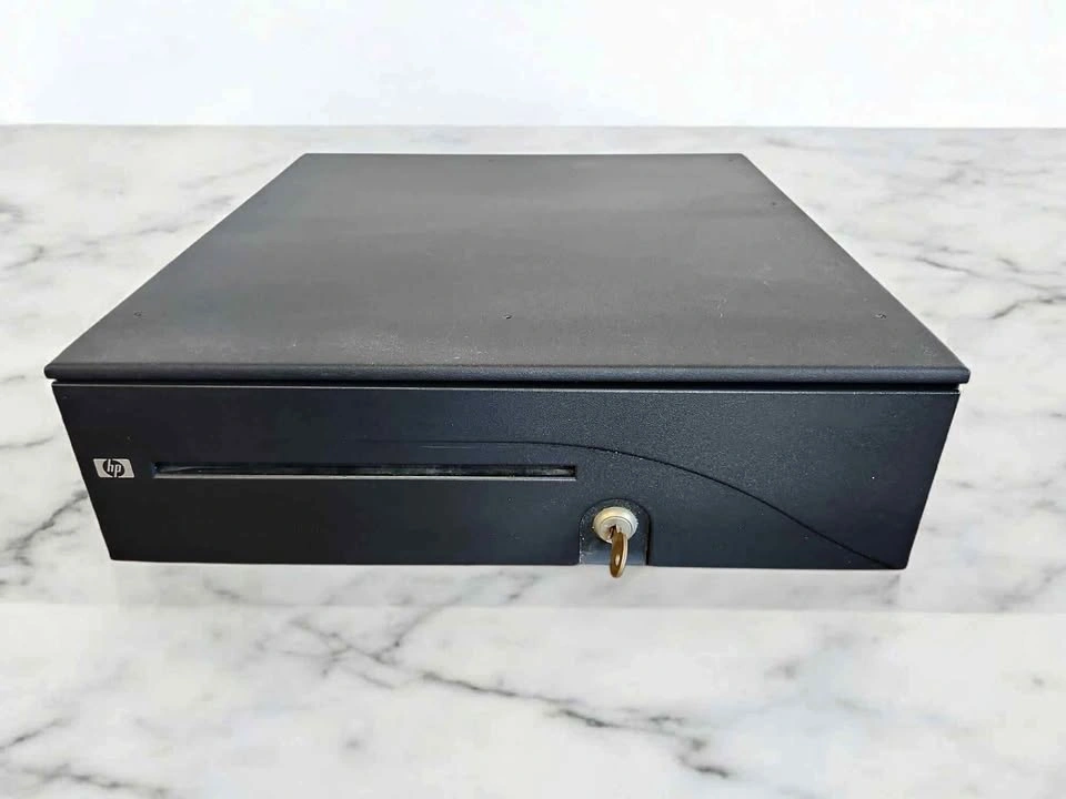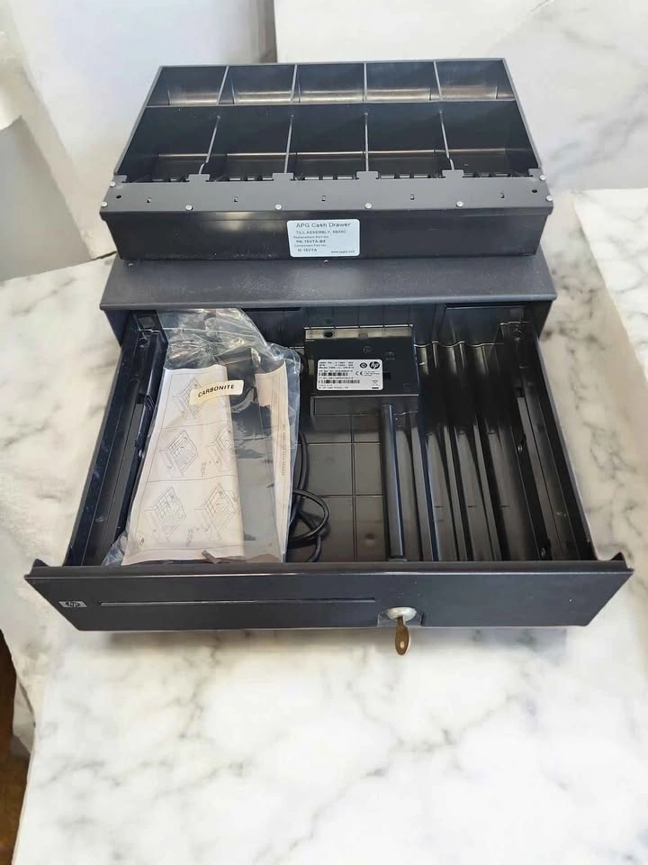 Heavy-duty cash drawer with a narrow footprint designed to minimize counter space usage. Can be use as a Car safe for cash or firearm safe. Storage: It includes a full-sized till and a deep under-till compartment for coin rolls and packaged currency, along with an adjustable media slot divider. Durability: Constructed from steel, it's designed for longevity and can withstand extensive use, with some models tested for millions of cycles. Connectivity: This model features a MultiPRO 320 interface with an 8P8C (RJ45) modular jack for connecting to receipt printers or POS terminals. Specifications: It typically has 6 coin compartments and a standard lock type with a keyed-alike system. HP cash drawer, specifically identified as an APG T320-BL1616 Heavy-Duty Adjustable Cash Drawer with MultiPRO 320 Interface, or similar models like the HP FK182AA.