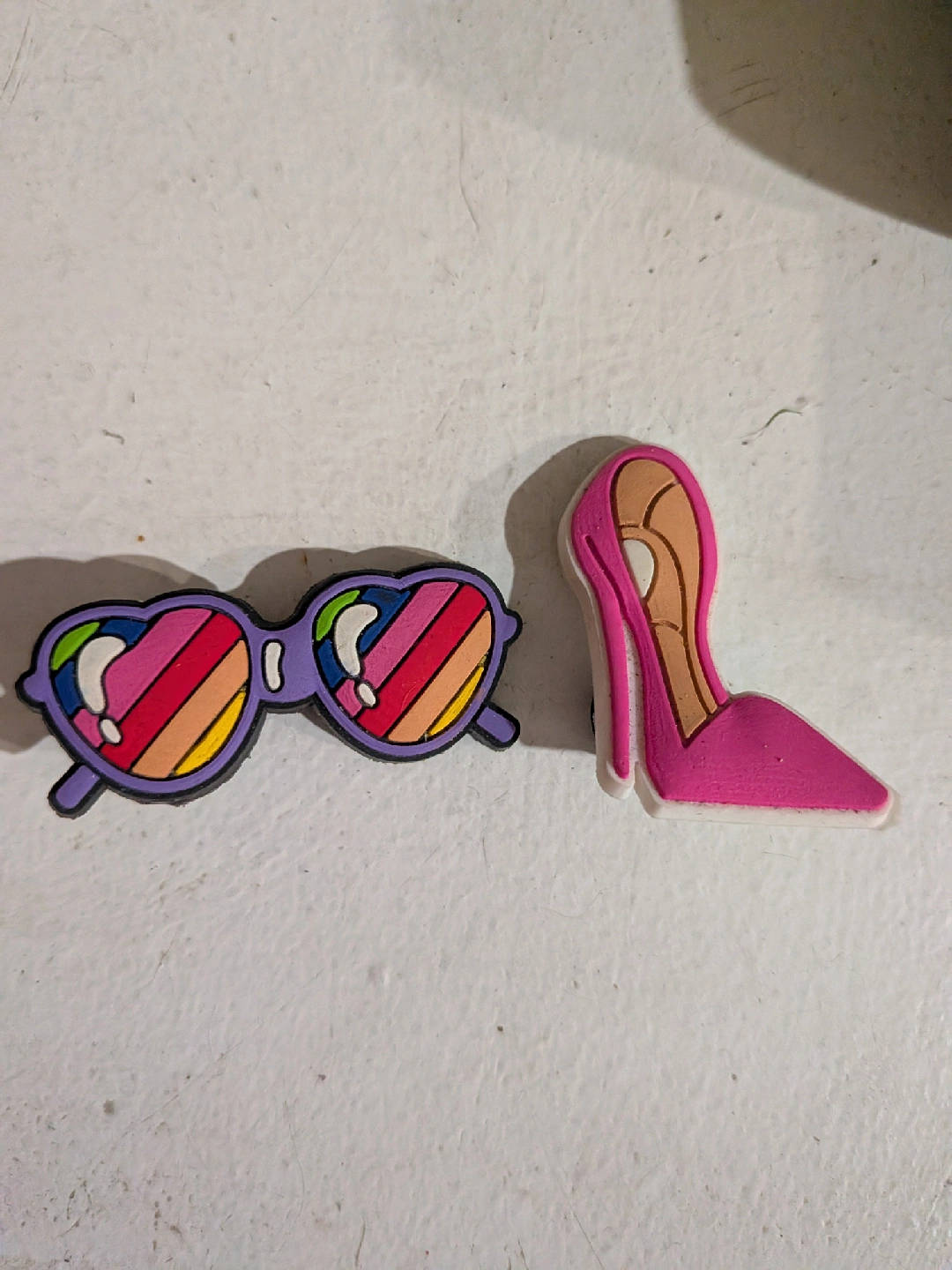 Add some fun to your Crocs with these cute Jibbitz charms! You get a pair of heart-shaped sunglasses and a stylish high heel charm. Perfect for customizing your favourite footwear
