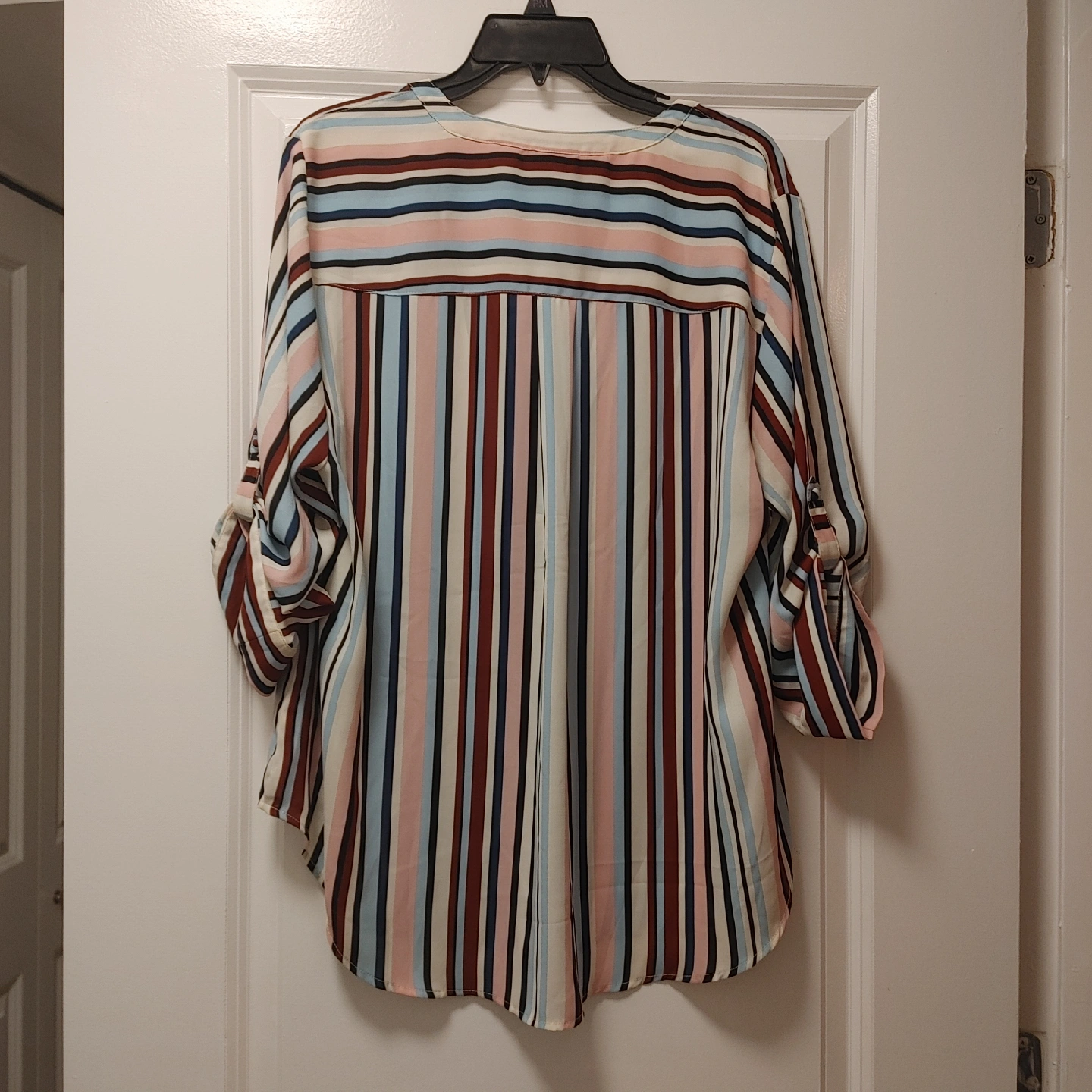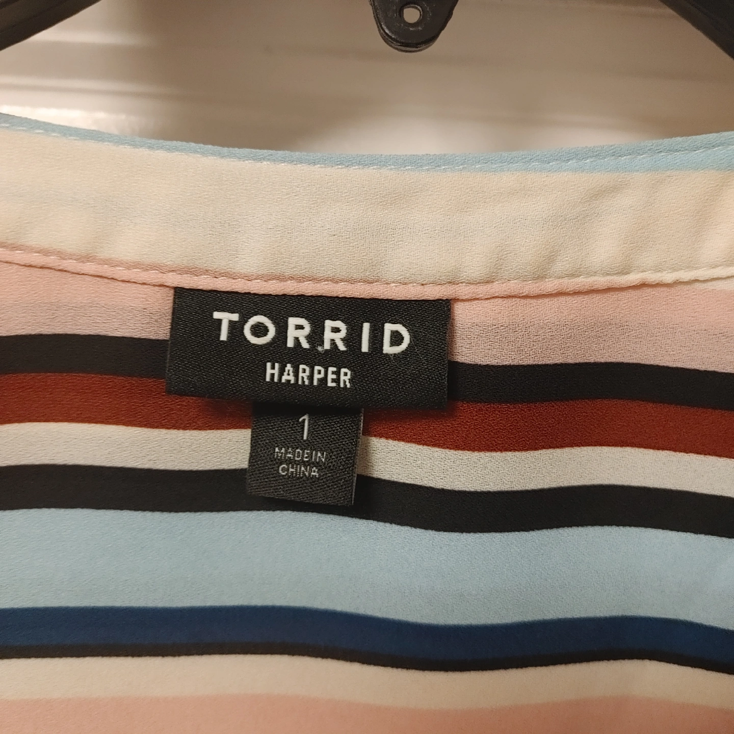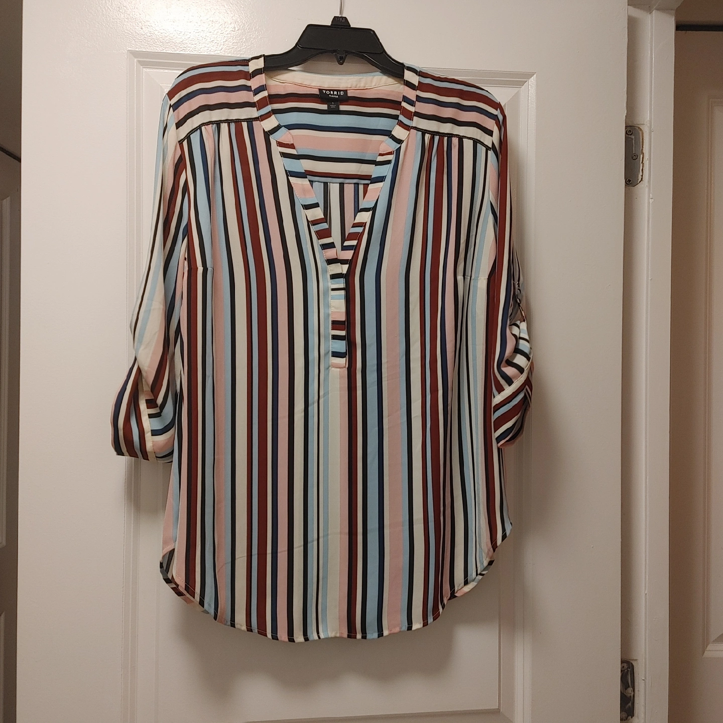 Selling a Torrid Harper blouse in size XL It features a colourful striped pattern and roll-tab sleeves. Great for a casual or work outfit!