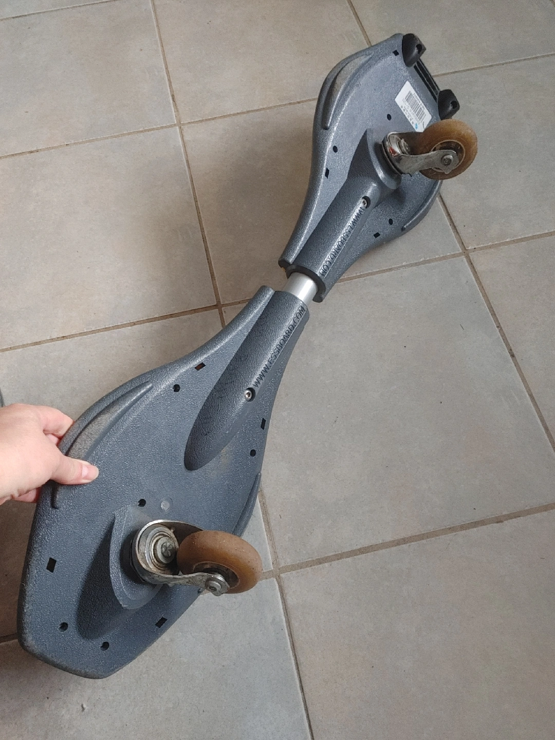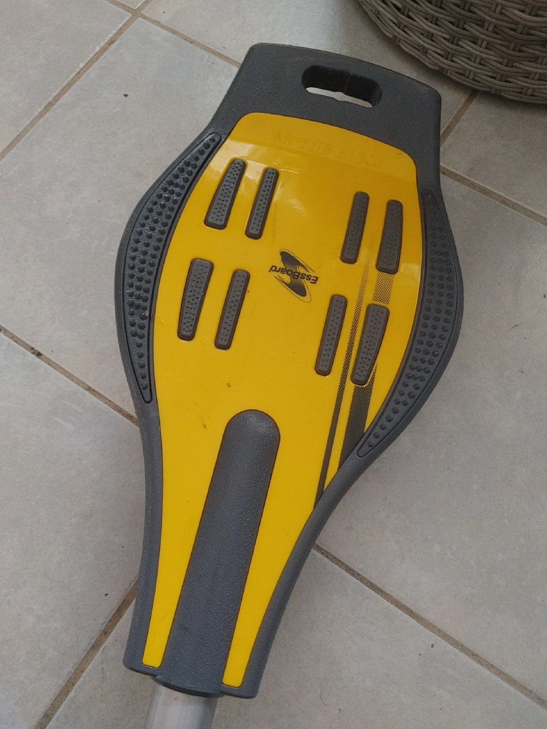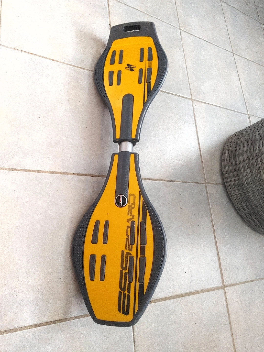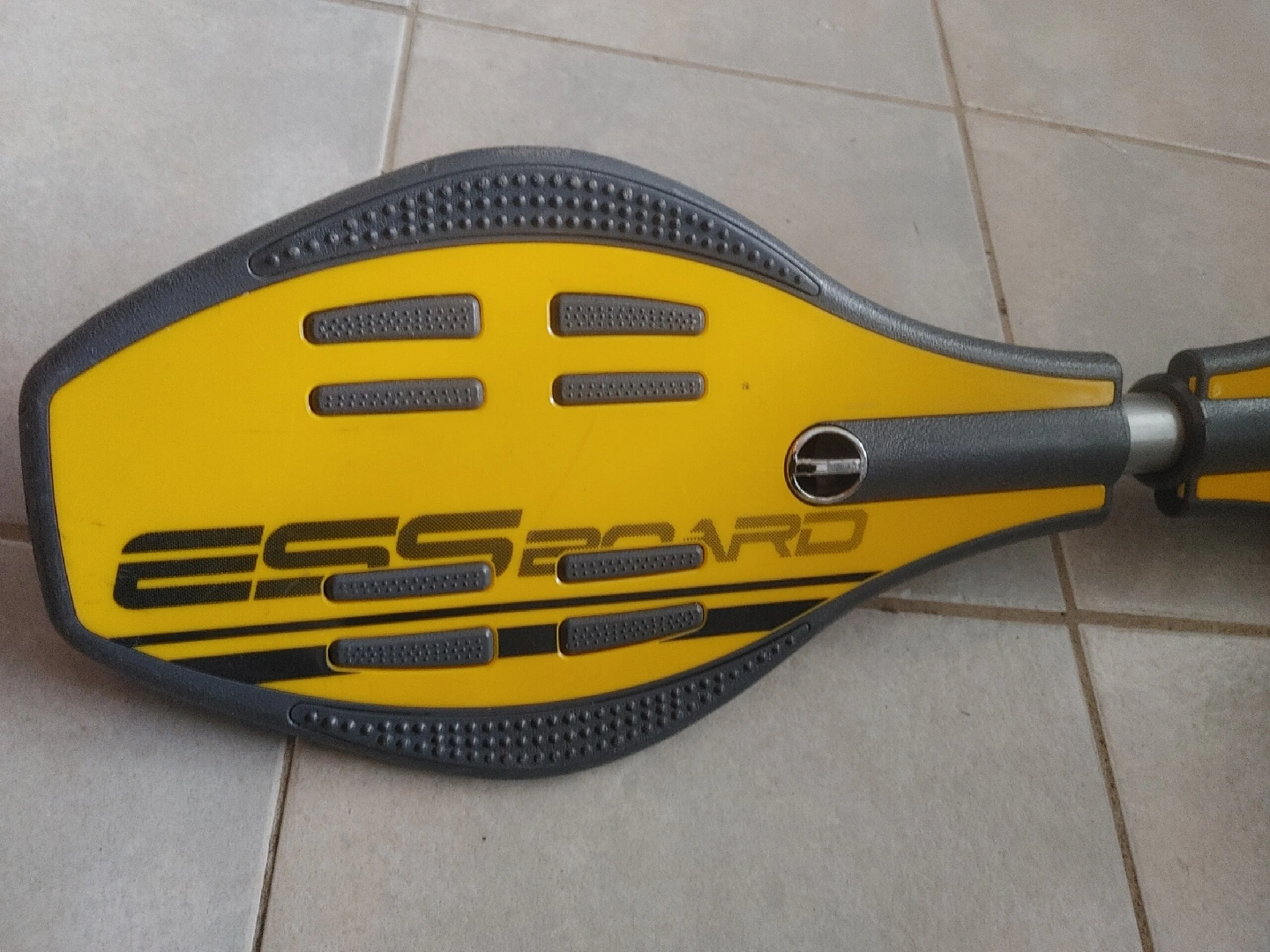 Selling an Essboard skateboard in yellow and grey. It's in good condition and ready for some fun!