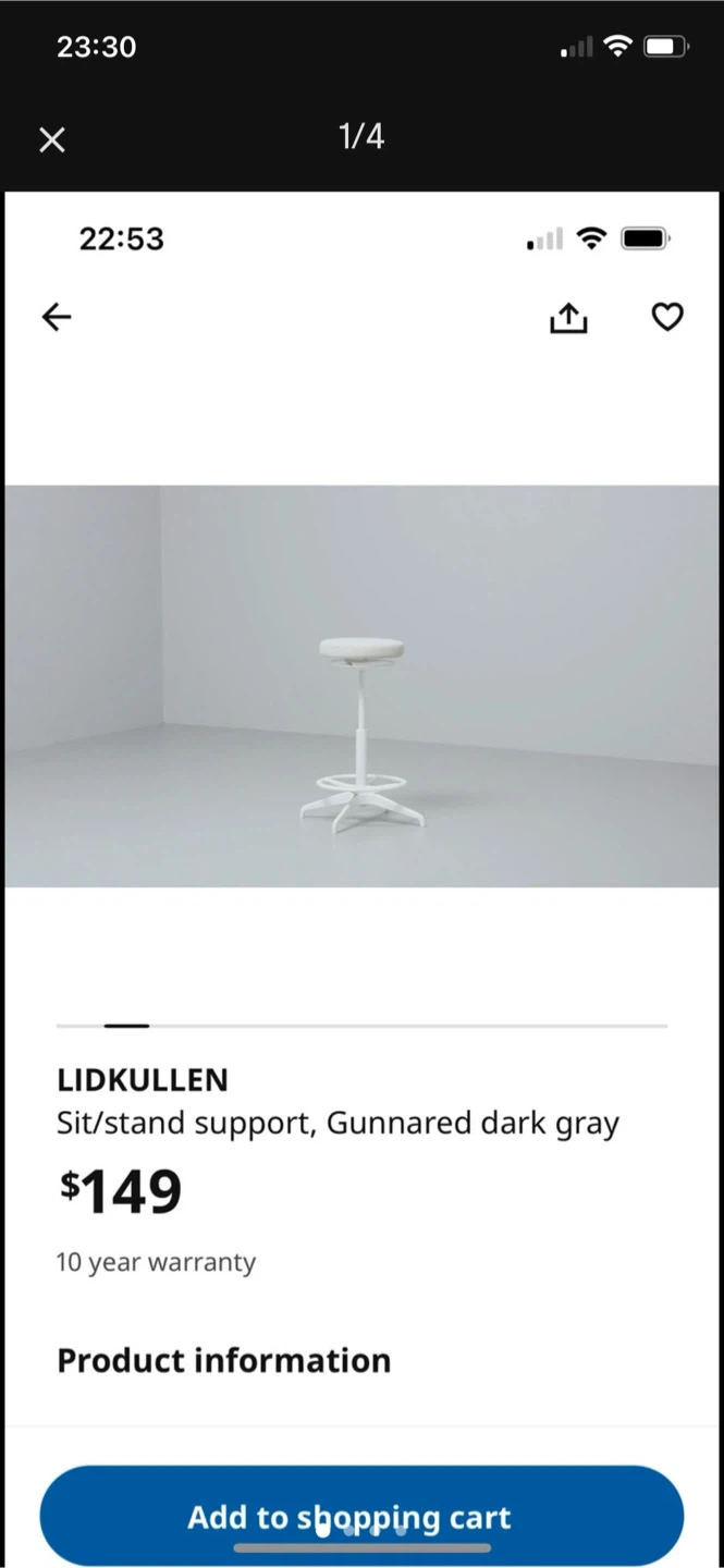 Selling a LIDKULLEN sit/stand support in Gunnared dark gray. It's in great condition and ready to use! This stool is perfect for anyone looking for a comfortable and adjustable seating option. Originally bought for $149.
