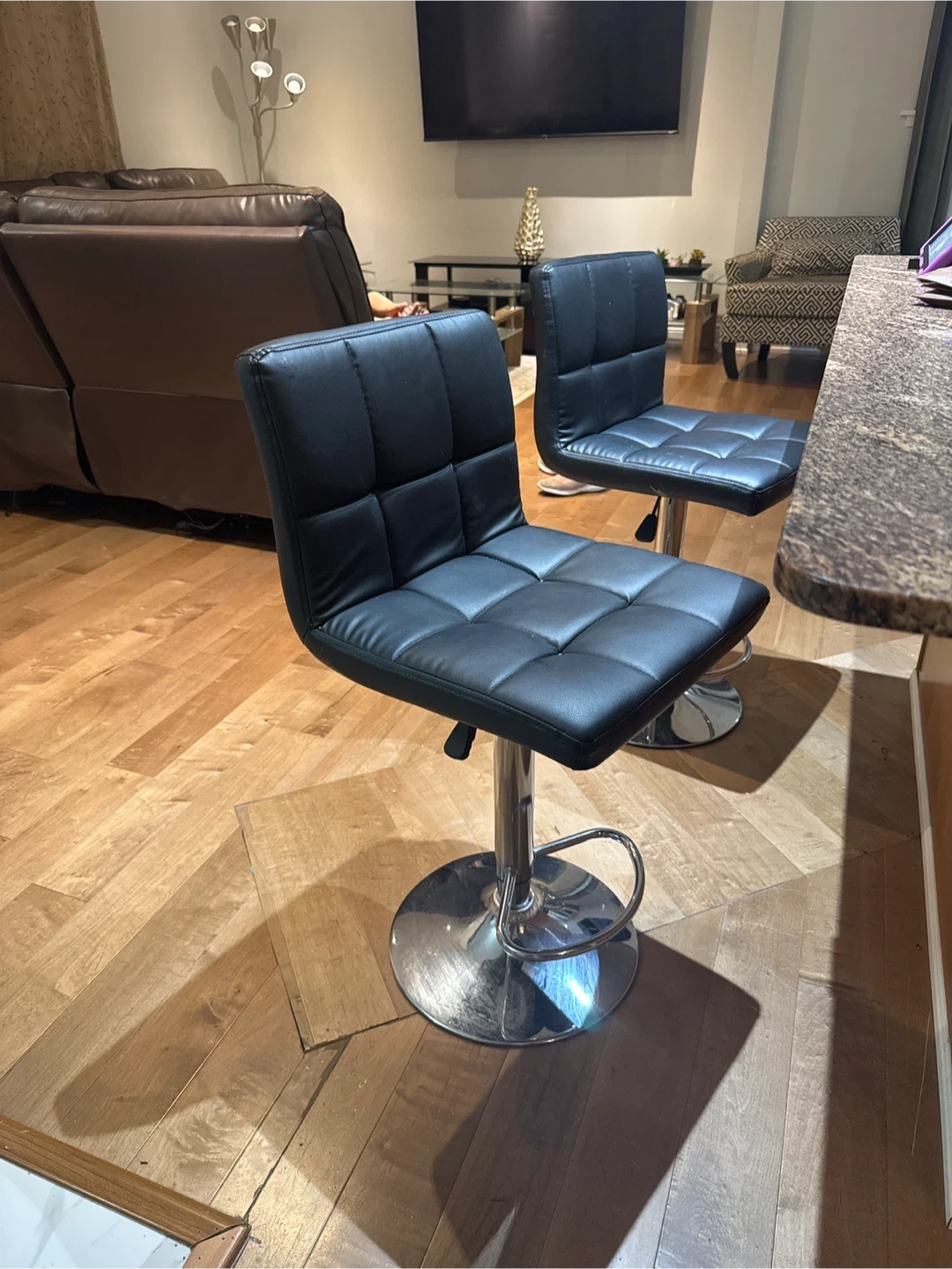 Selling a set of two swivel bar stools! They're in great condition and would be perfect for a kitchen island or bar area. The stools are black with a chrome base and have a comfortable padded seat Faux leather.