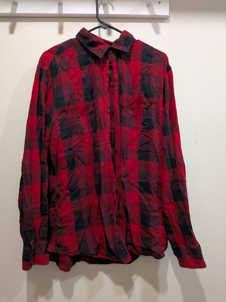 A classic red and black plaid flannel shirt! Perfect for layering or wearing on its own. It's in great condition and ready for a new home size XL