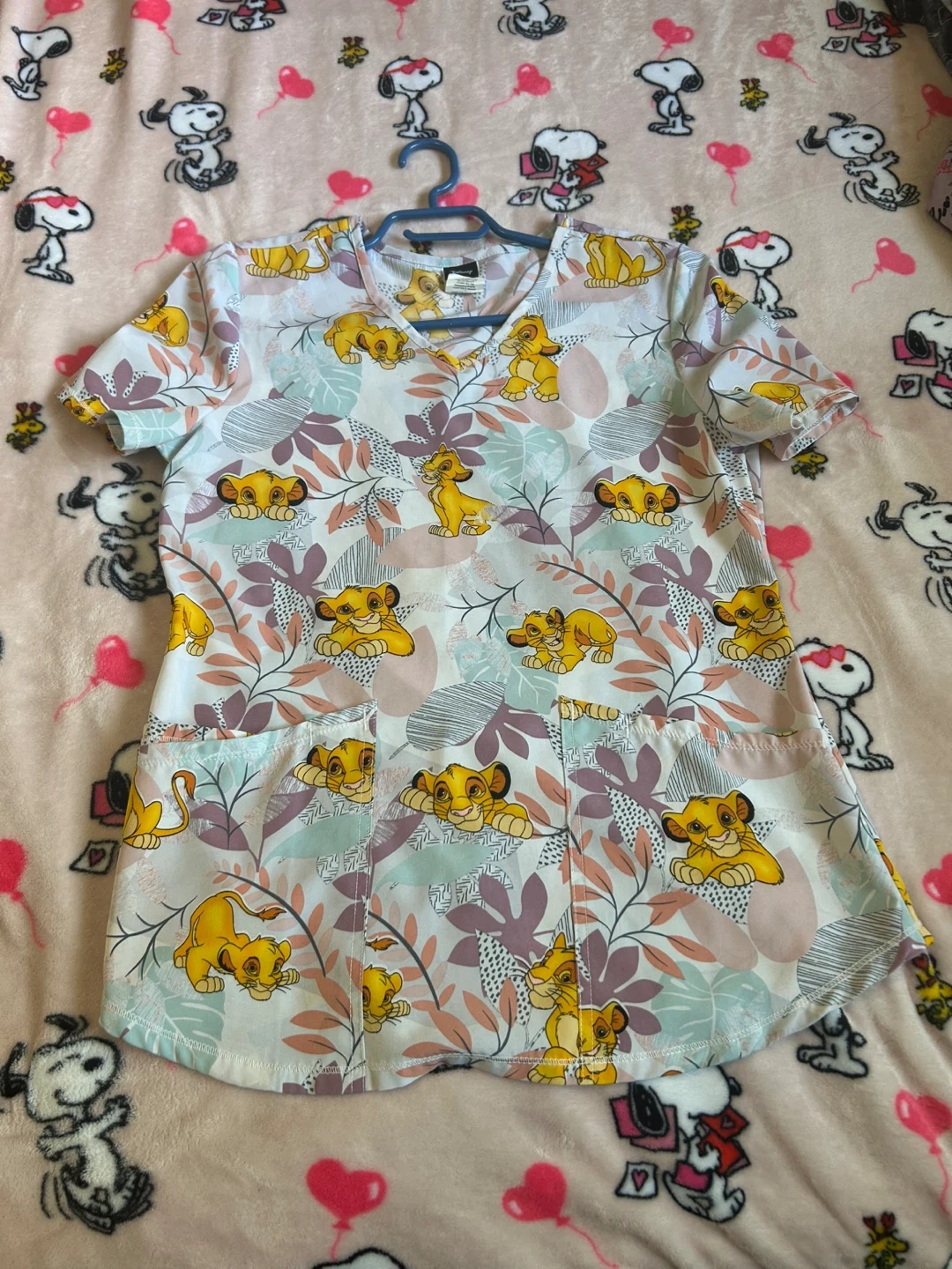 Super cute scrub top featuring a Lion King print! It's a size small and in great condition. Perfect for anyone working in healthcare or a similar field who wants to add a bit of fun to their uniform