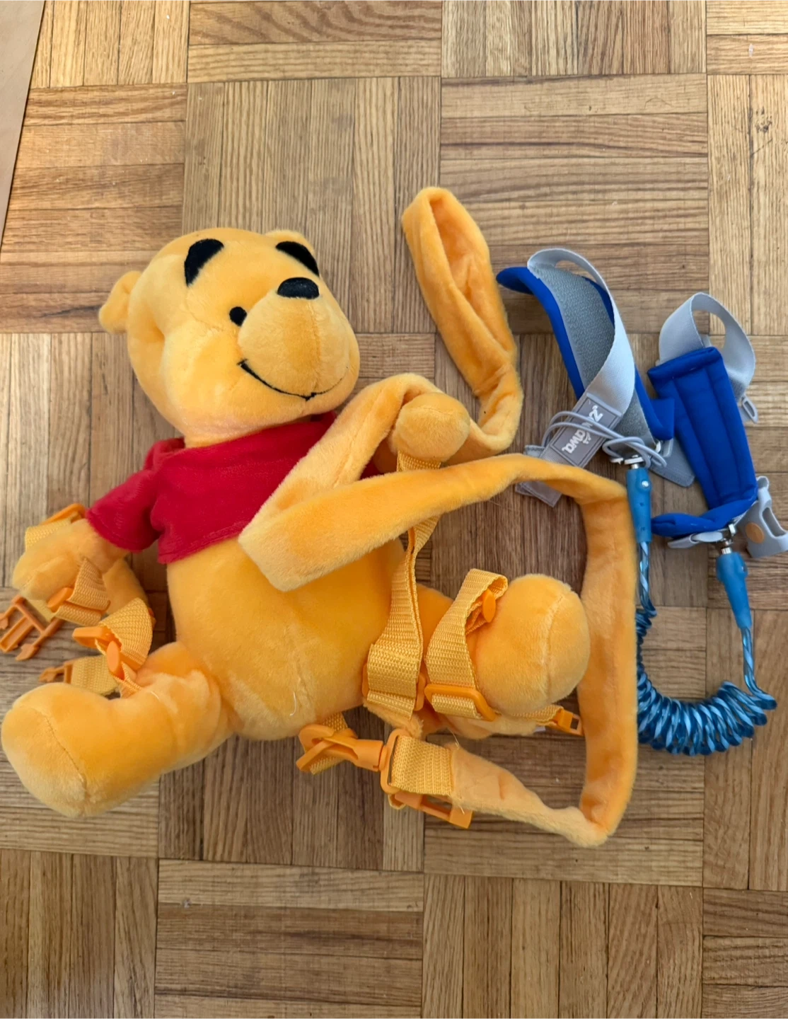 Keep your little one safe and close with this adorable Winnie the Pooh toddler safety leash backpack! It's in great condition and ready for new adventures. Blue and grey wrist leash included as well.