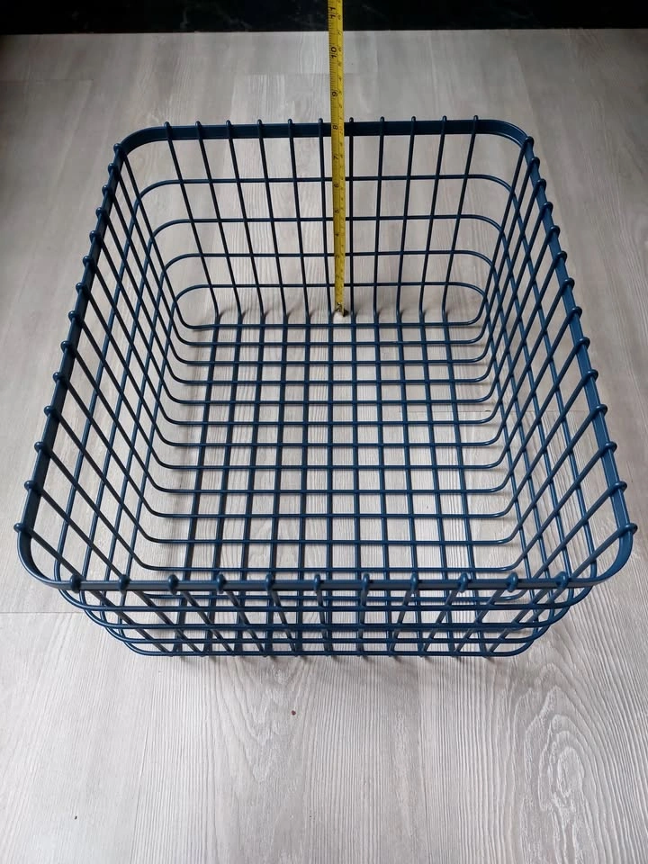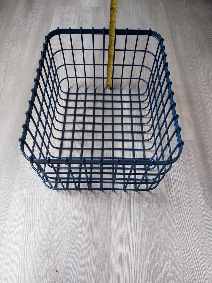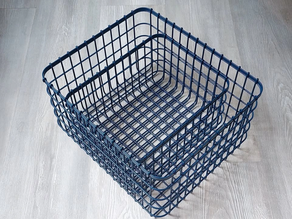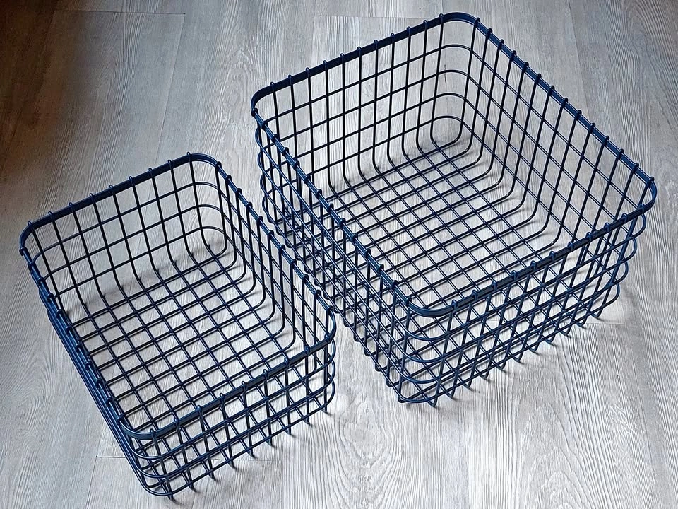 These are two of my favourite storage baskets, made by OUI. They're elegant, yet extremely sturdy. The openings are reinforced, with no sharp edges. They easily carry books and other heavy items. Sold as a set, like new. Dimensions: W12in x L14in x H8in Dimensions: W9in x L11.5in x H6.5in