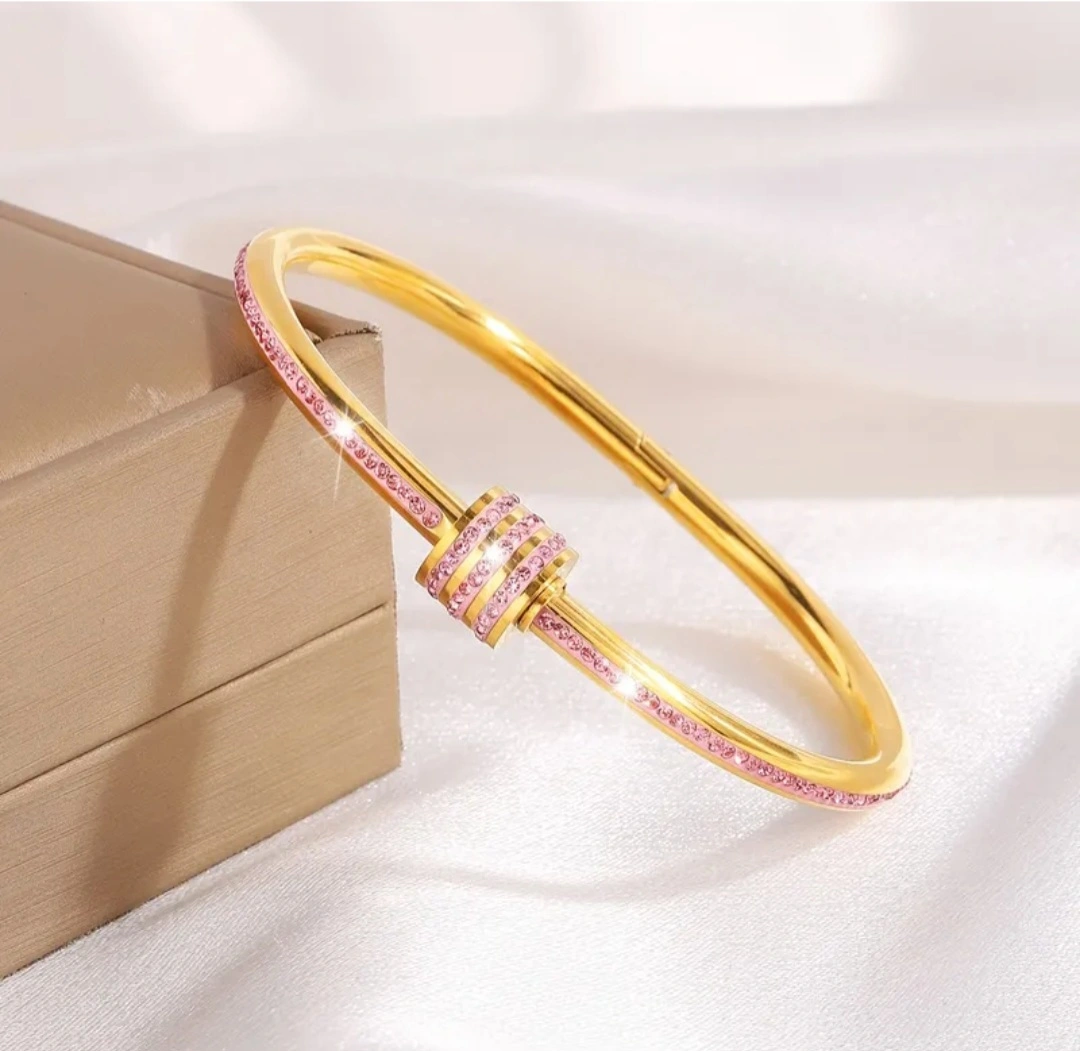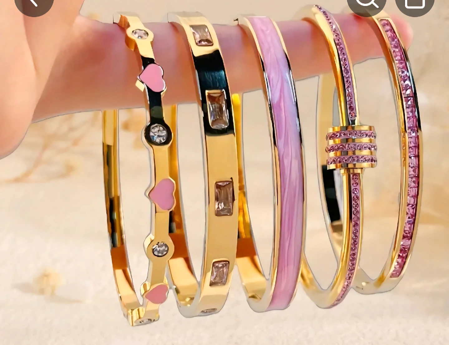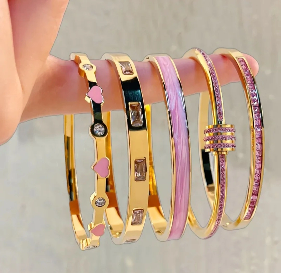 Here's a set of gold tone bangle bracelets! They come in different styles, some with pink enamel and some with embedded crystals. Perfect for adding a touch of sparkle to your outfit