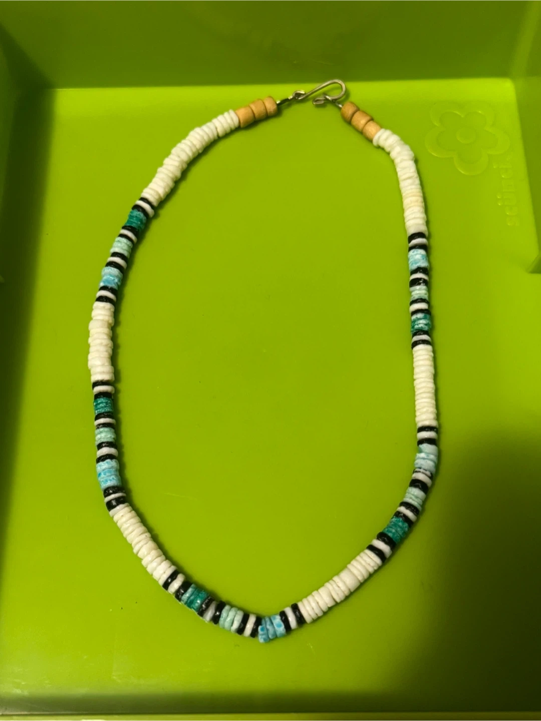 Selling a beaded necklace made of shells. This unique piece features a mix of white, black, and turquoise beads, perfect for adding a pop of colour to any outfit. The necklace is in great condition and ready to find a new home!