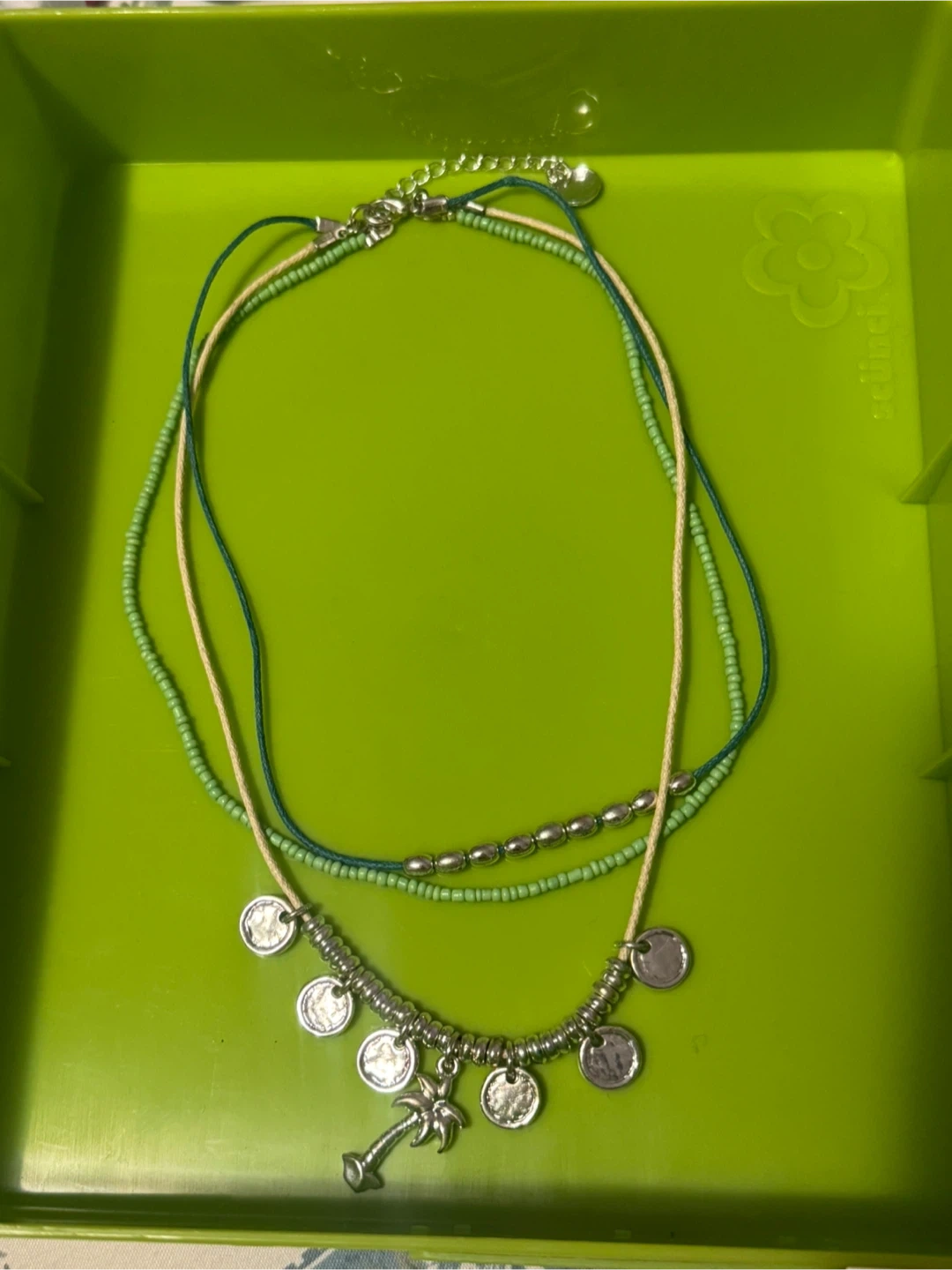 Cute layered necklace featuring a palm tree charm! It has a beachy vibe with green and beige beaded strands
