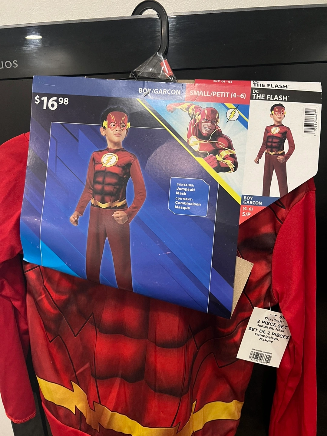 Selling a The Flash costume for boys, size small (4-6). It includes a jumpsuit and mask. This 2-piece set is perfect for dress-up or Halloween!