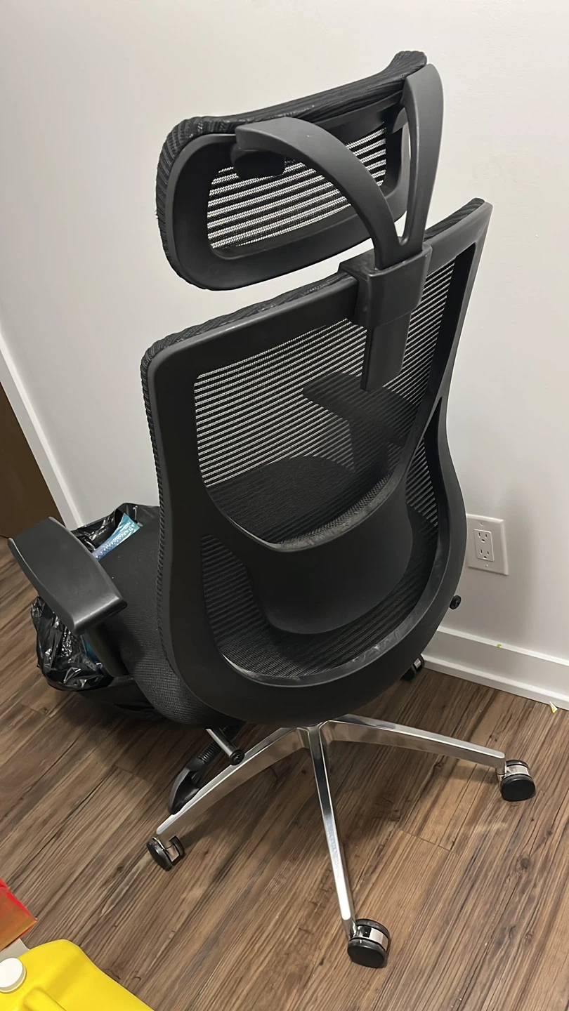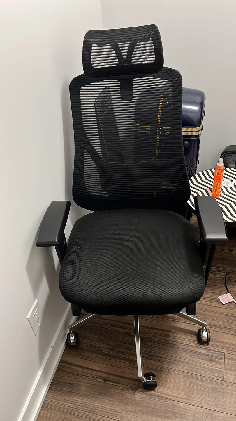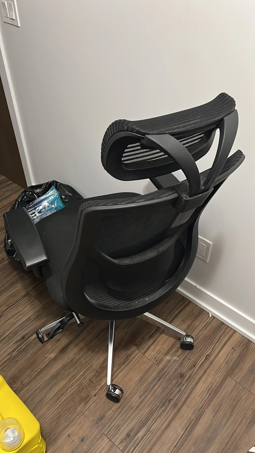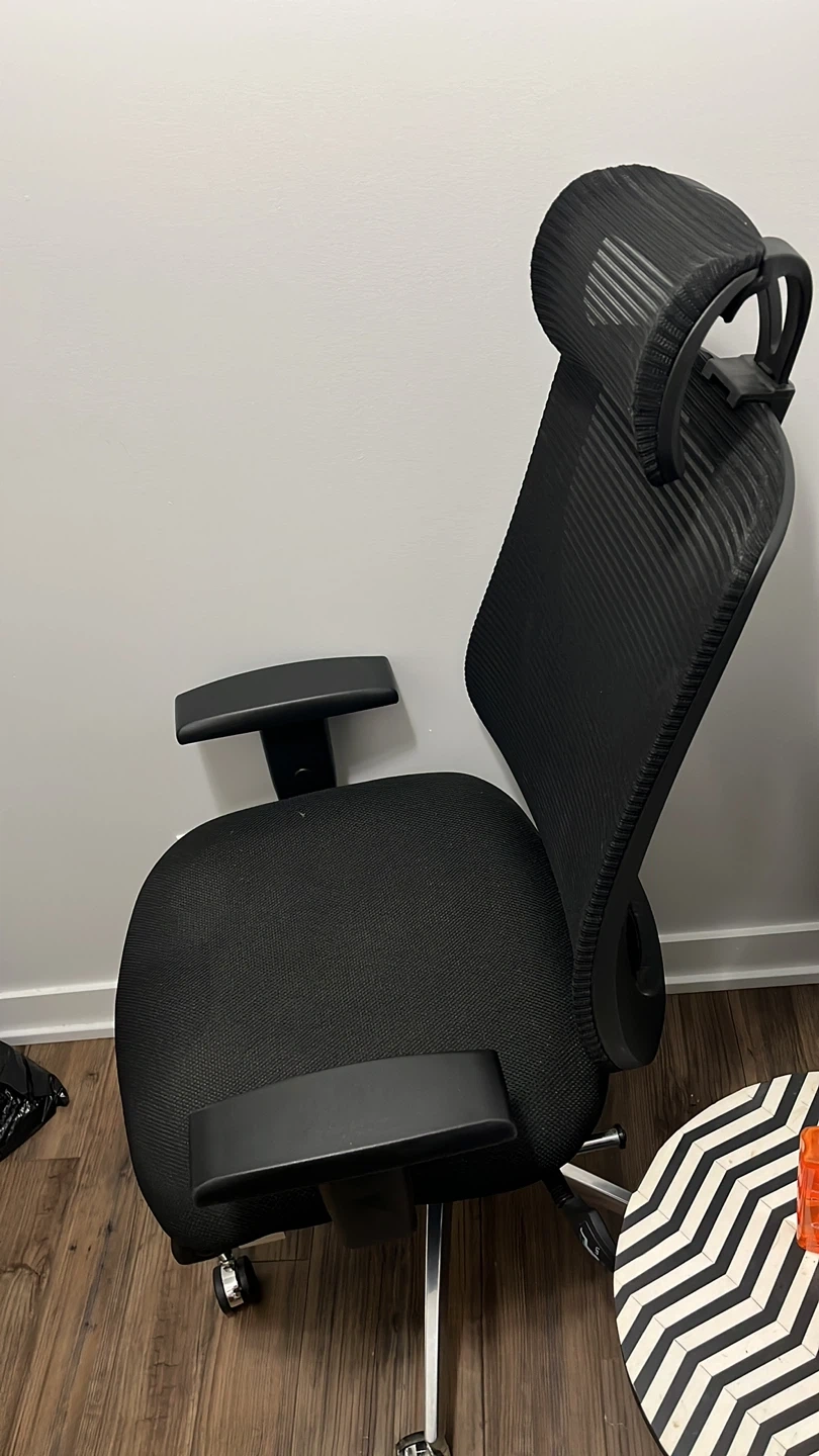 Selling a comfortable black office chair! It features a mesh back and a supportive headrest. Perfect for working from home or the office. It's in great shape and ready for a new home!