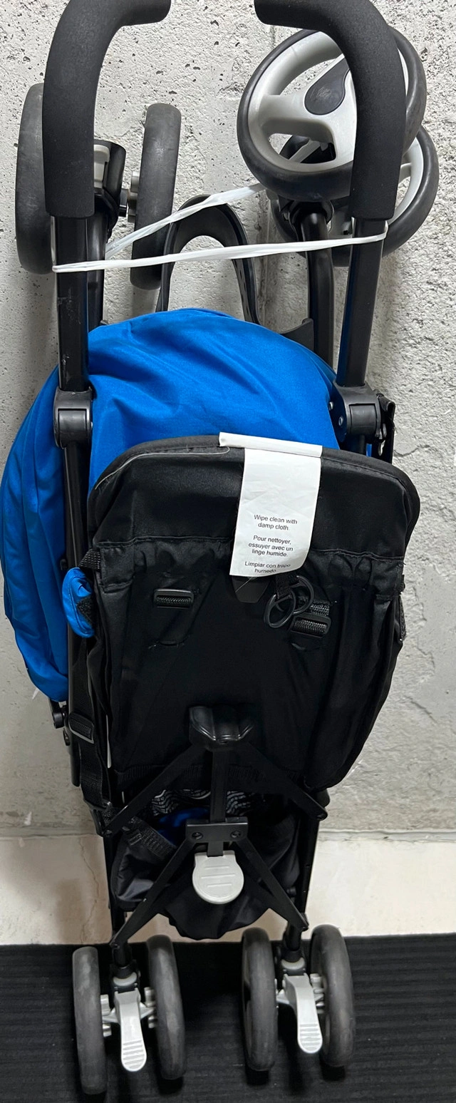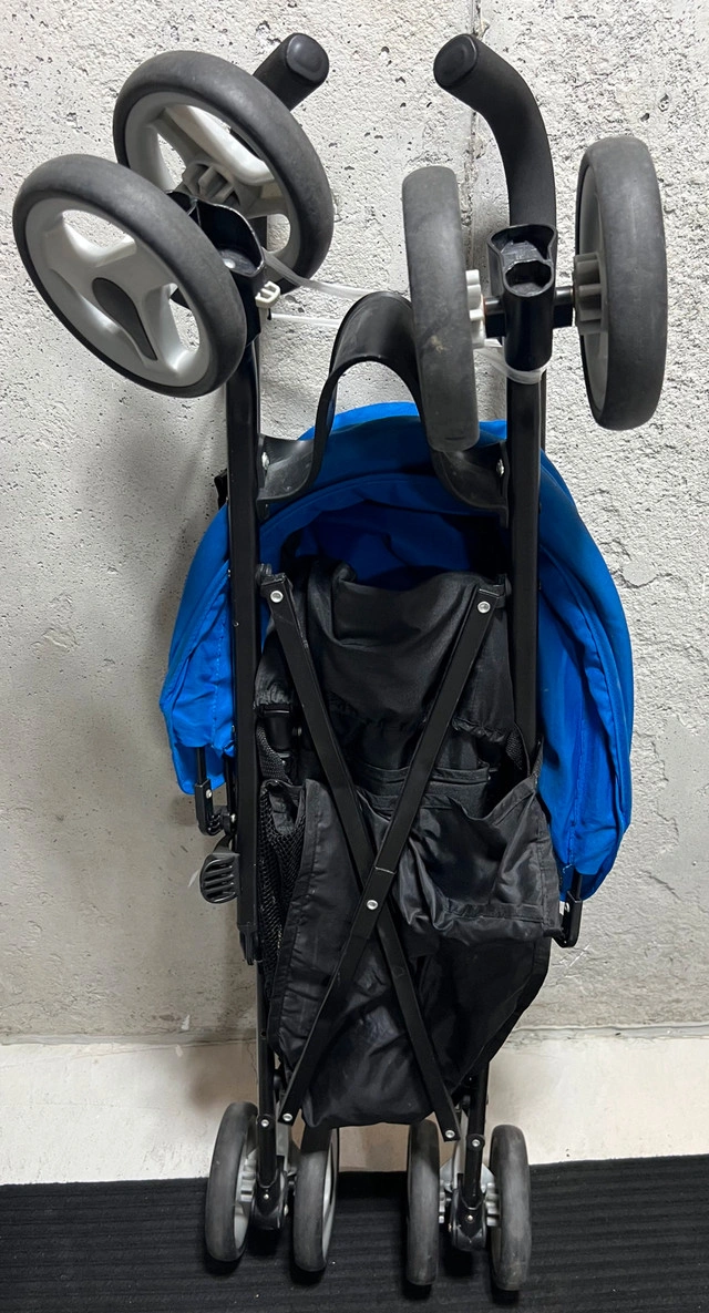 This is a blue and black stroller that is in used condition, but ready for a new child. This lightweight stroller is perfect for travel, and folds up for easy storage. Here are some additional details: * Compact fold * Storage basket * Lightweight design If the ad is up, it's available!