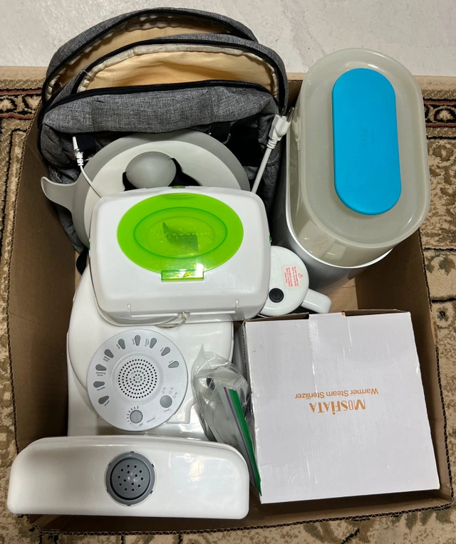 Clearing out some baby items! This box includes a variety of gently used essentials perfect for new parents. You'll find items such as a bottle warmer/sterilizer, sound machine, diaper bag and potty training seat, all in good condition. Please note that these items are used, but well-maintained and ready for a new home. If the ad is up, the item is available!