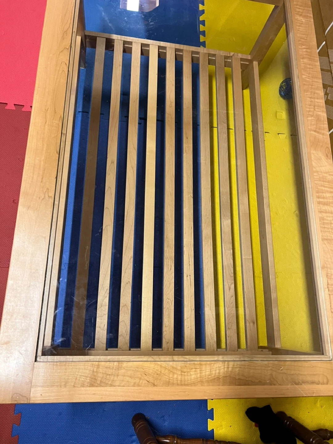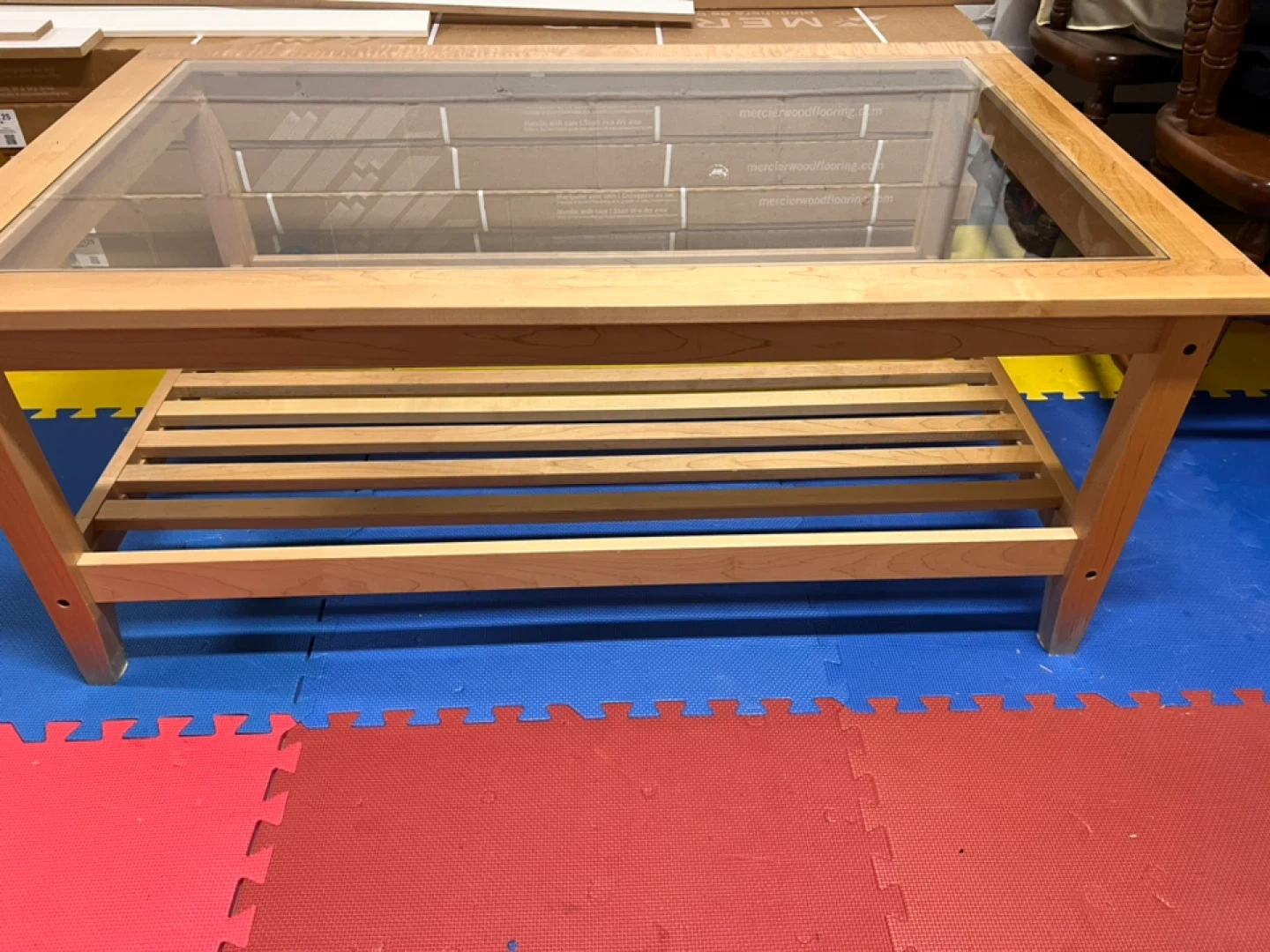 Selling a wooden coffee table with a glass top. It's in great shape and would look lovely in any living room. Has a shelf underneath for extra storage or decor