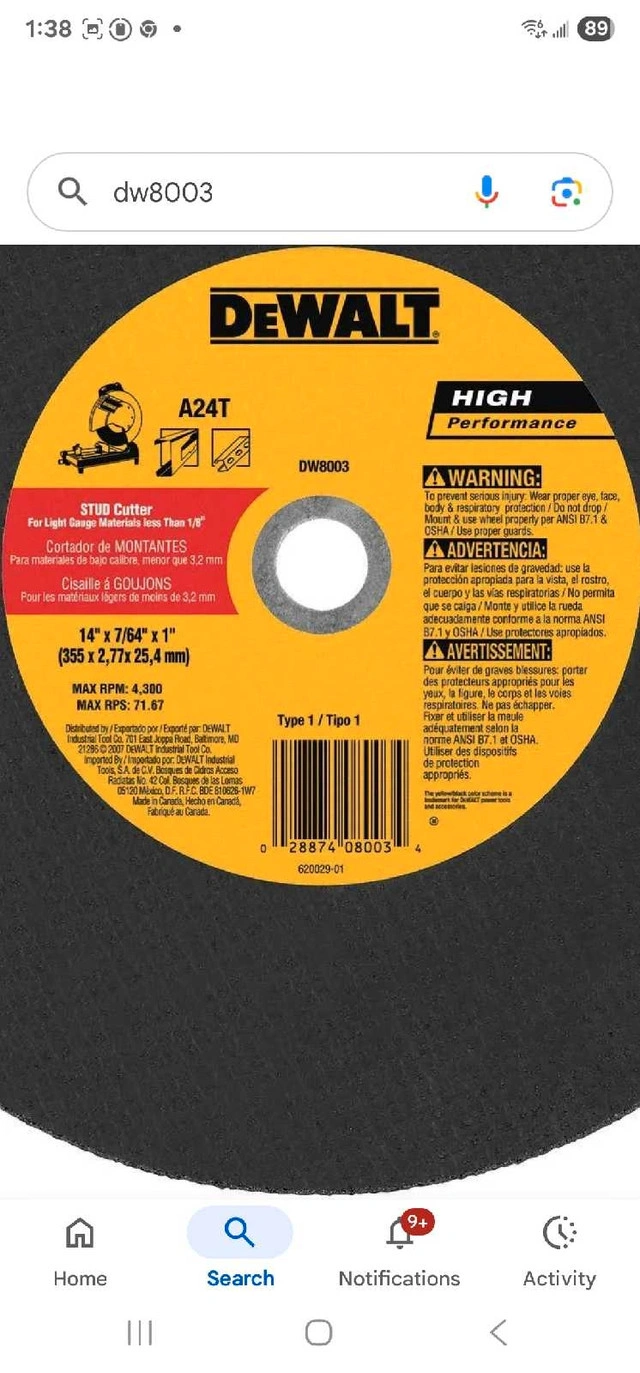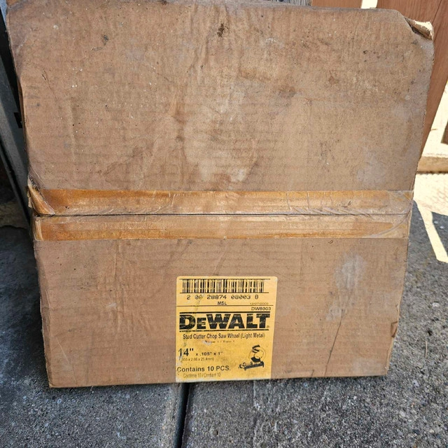 I have 1-box of (10) brand new DeWalt 14" chopsaw wheels for light metal. It's a DW8003 model, 14 inches by 7/64ths of an inch with a 1 inch arbor. Will sell individual wheels for $20 each. Key Features: * Designed for light gauge metals * High-performance abrasive * Durable construction. If the ad is up, it's available!