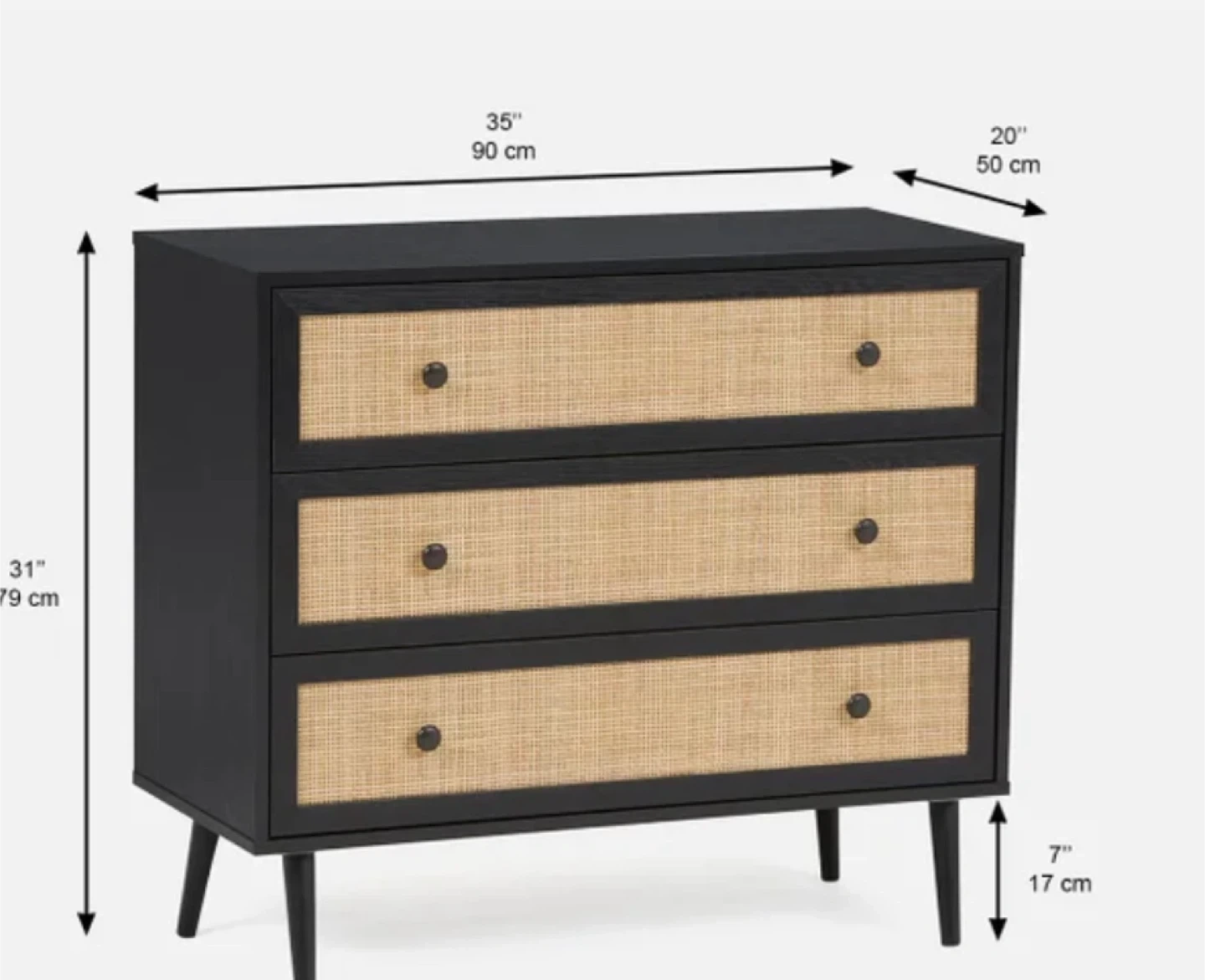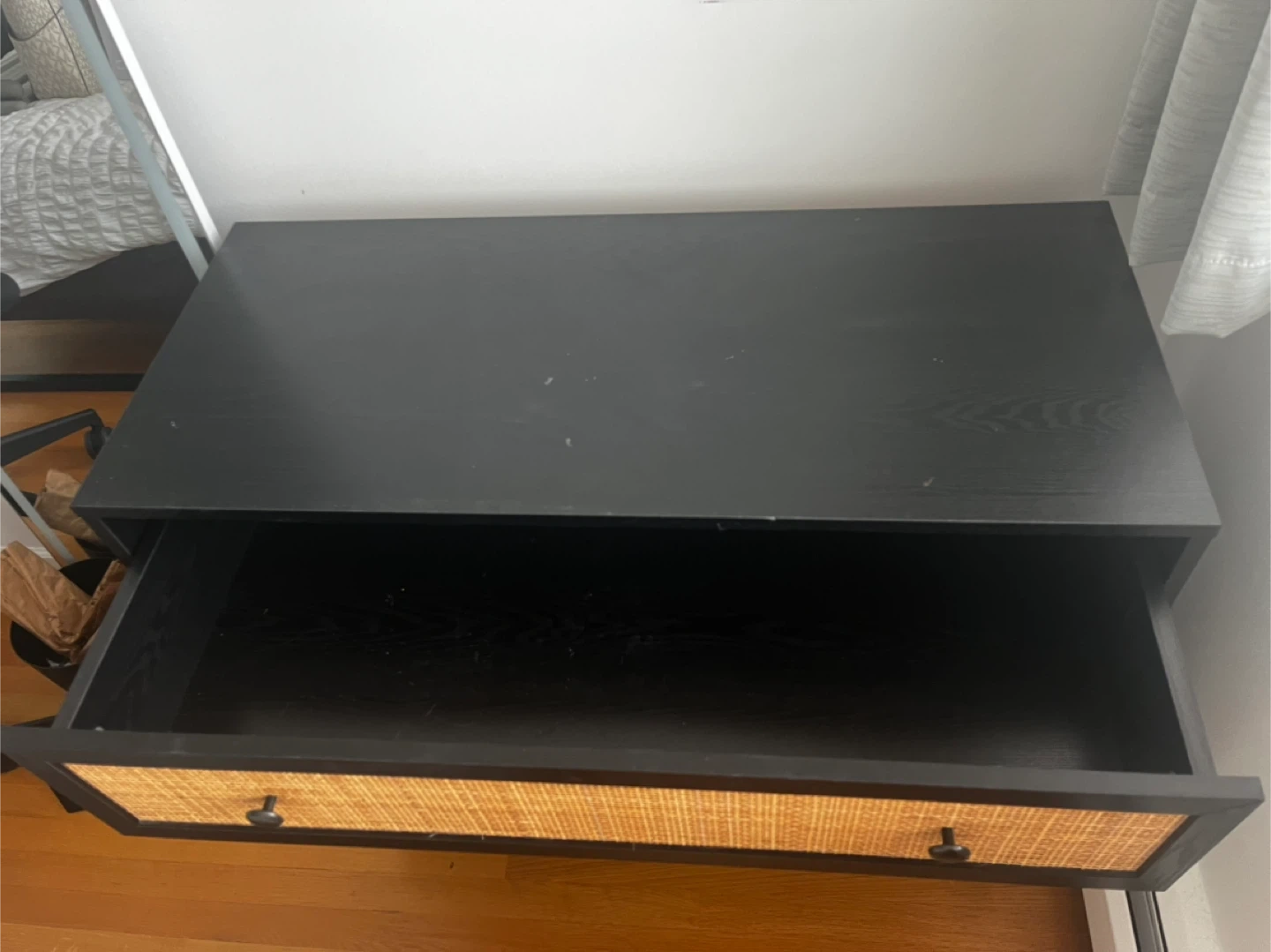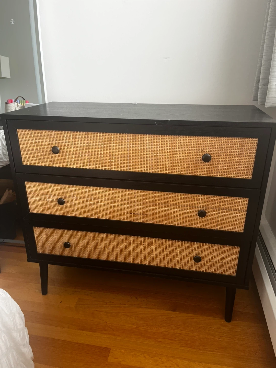 Looking to sell this lovely 3-drawer dresser! It's in great shape and would look fantastic in any bedroom or living space. Dimensions are 35" wide, 20" deep, and 31" tall. The drawers have a beautiful rattan face that adds a touch of natural texture to the piece Pick up west end