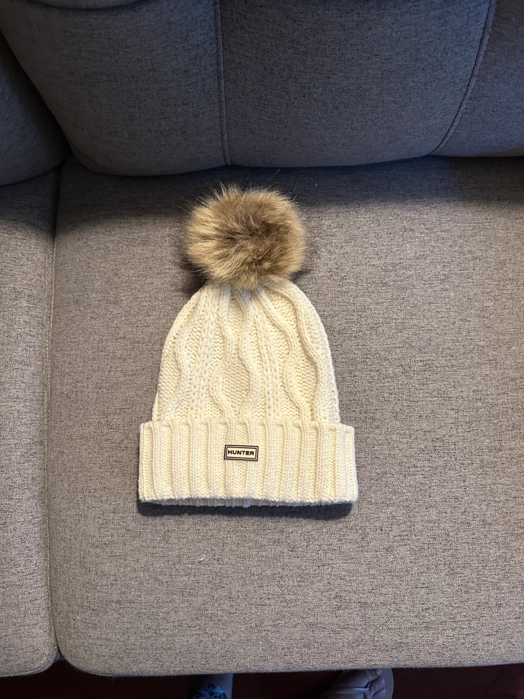 Keep your head warm with this cozy Hunter knit beanie! It's a cream colour and features a cute pom pom on top. The beanie is in great condition and ready for a new owner.