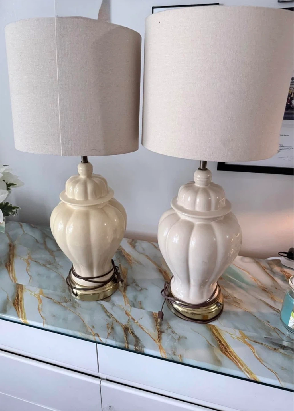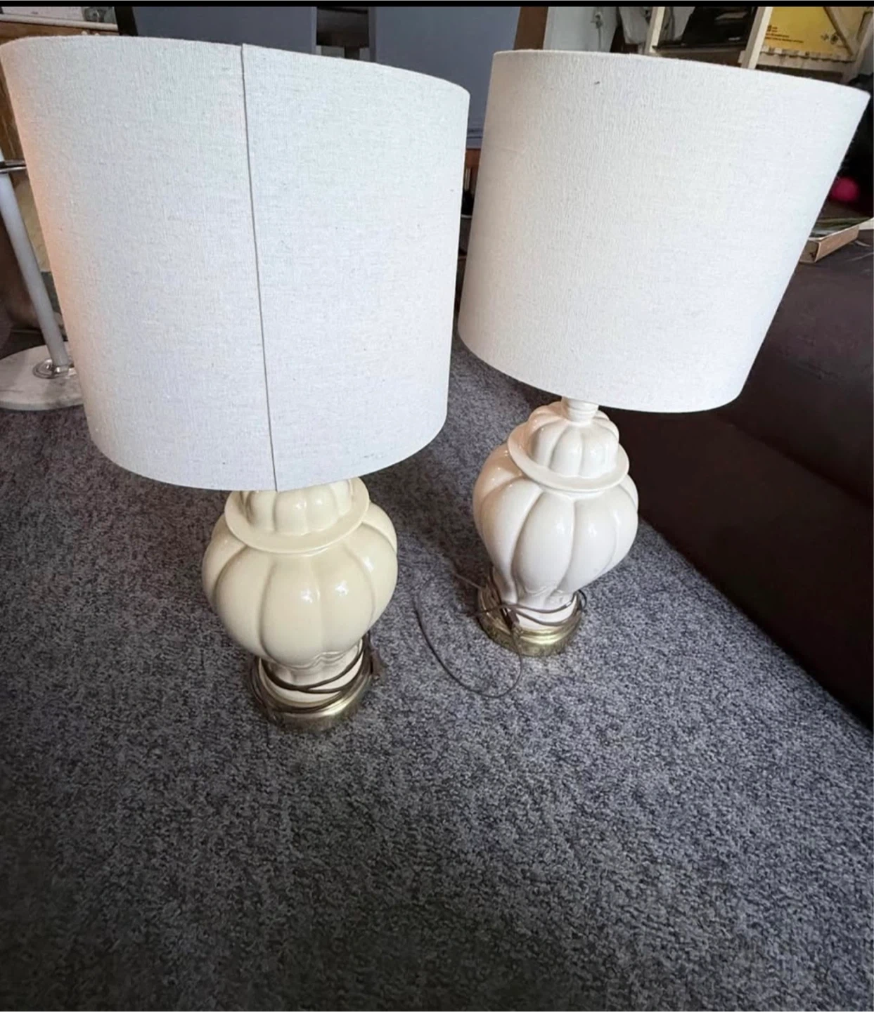 Selling a set of two cream-coloured ceramic table lamps. They feature a unique, decorative base and a neutral-toned lampshade that would complement any room. 1 lamp is not working and I don’t know how to fix it so Im giving it for free