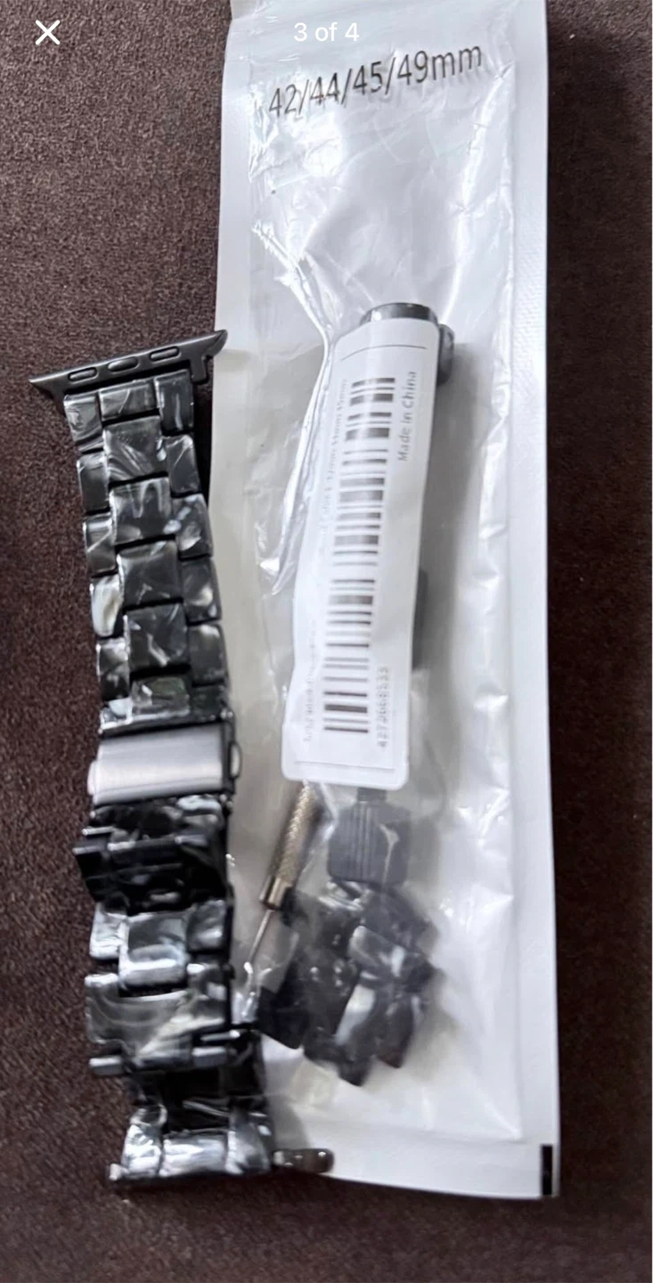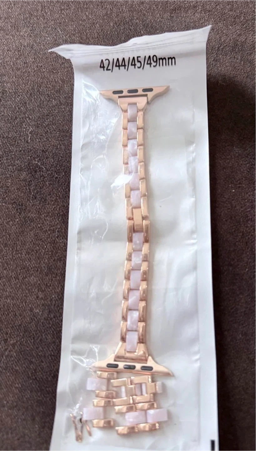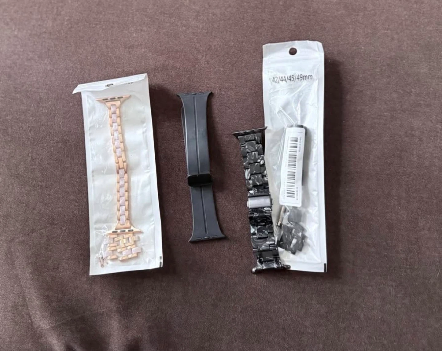 Selling new Apple Watch bands! These fit the 42mm, 44mm, 45mm, and 49mm Apple Watches. One is a rose gold colour, one is black, and the other is a marbled black and white colour. All are brand new and still in their original packaging 5 each