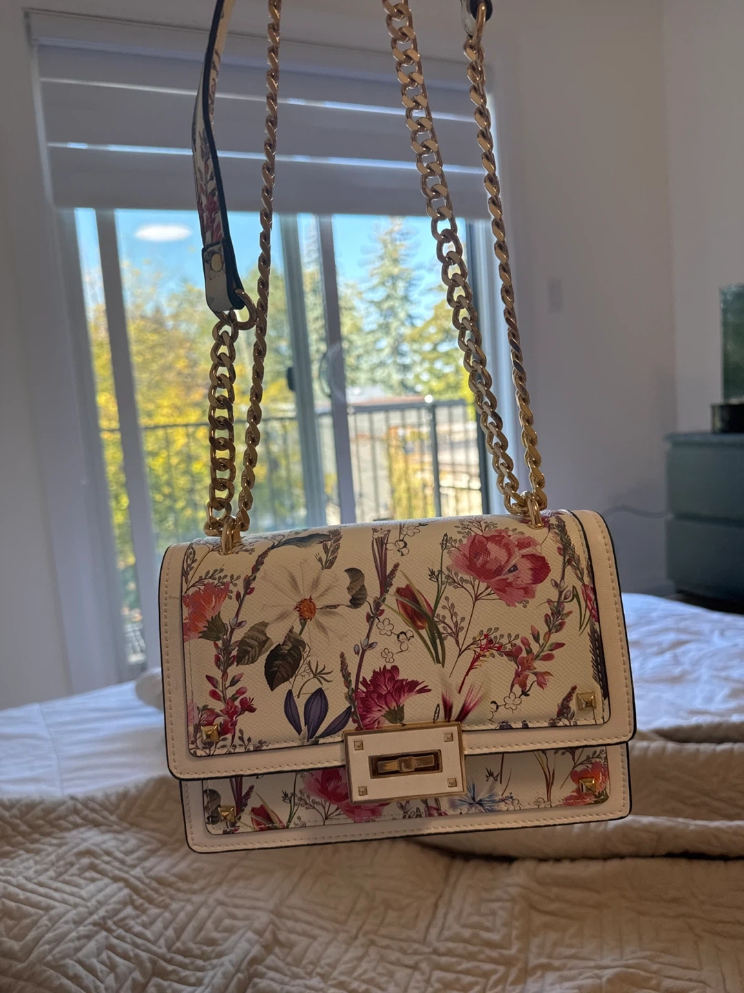 Beautiful Aldo shoulder bag with a beautiful floral print! The gold chain adds a touch of elegance. It is new and is perfect for adding a touch of color to any outfit, it has no damage, it still has its plastic
