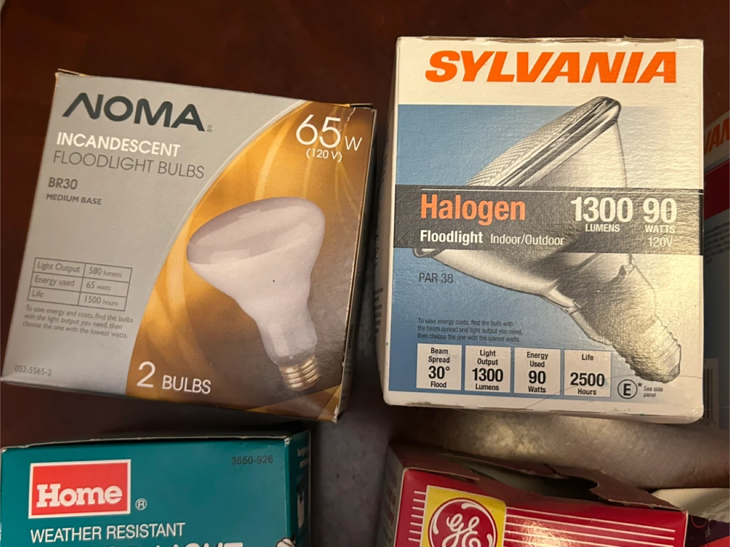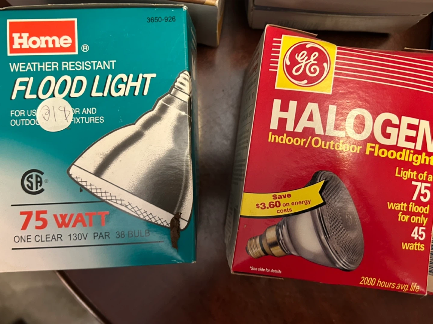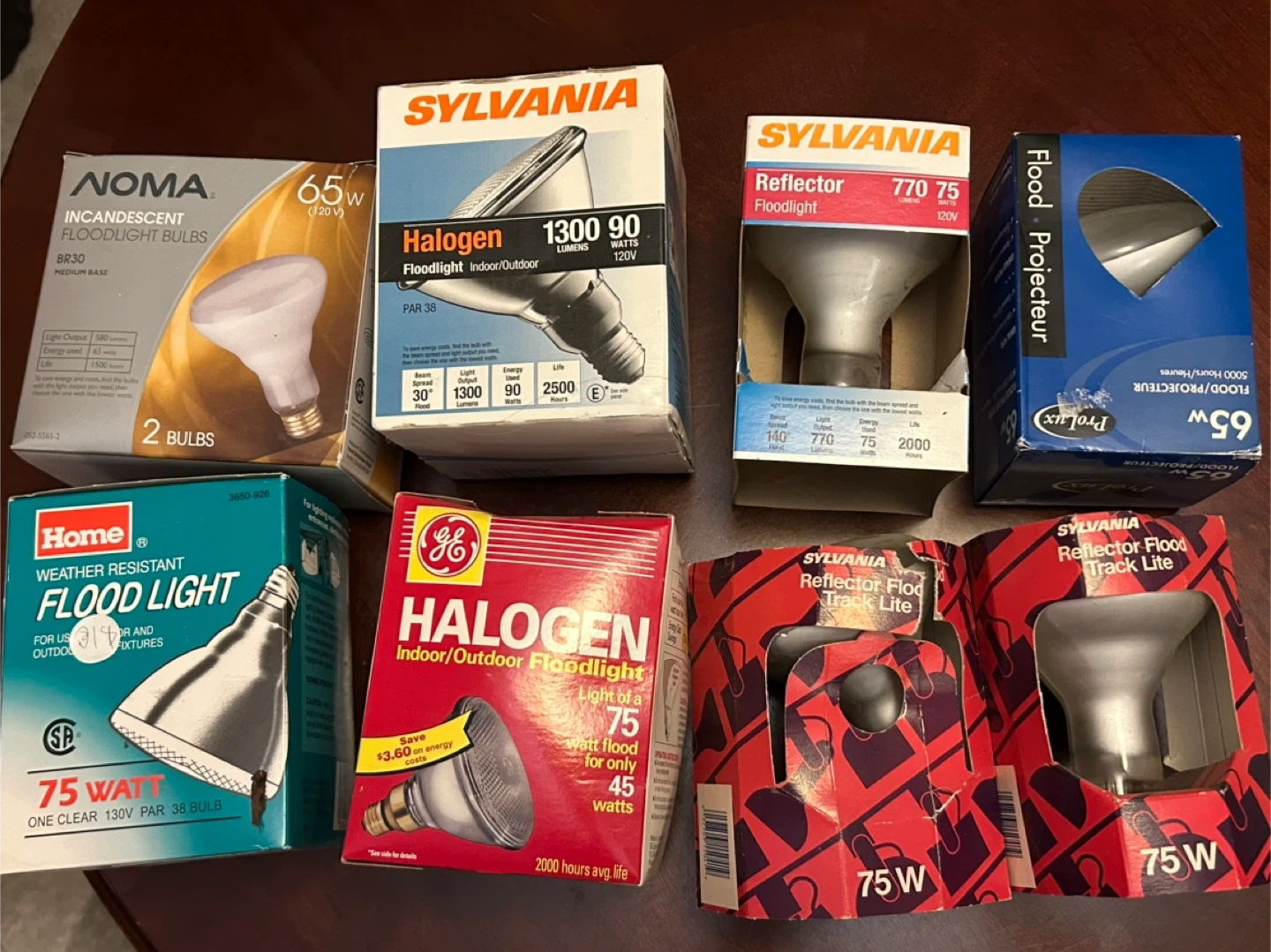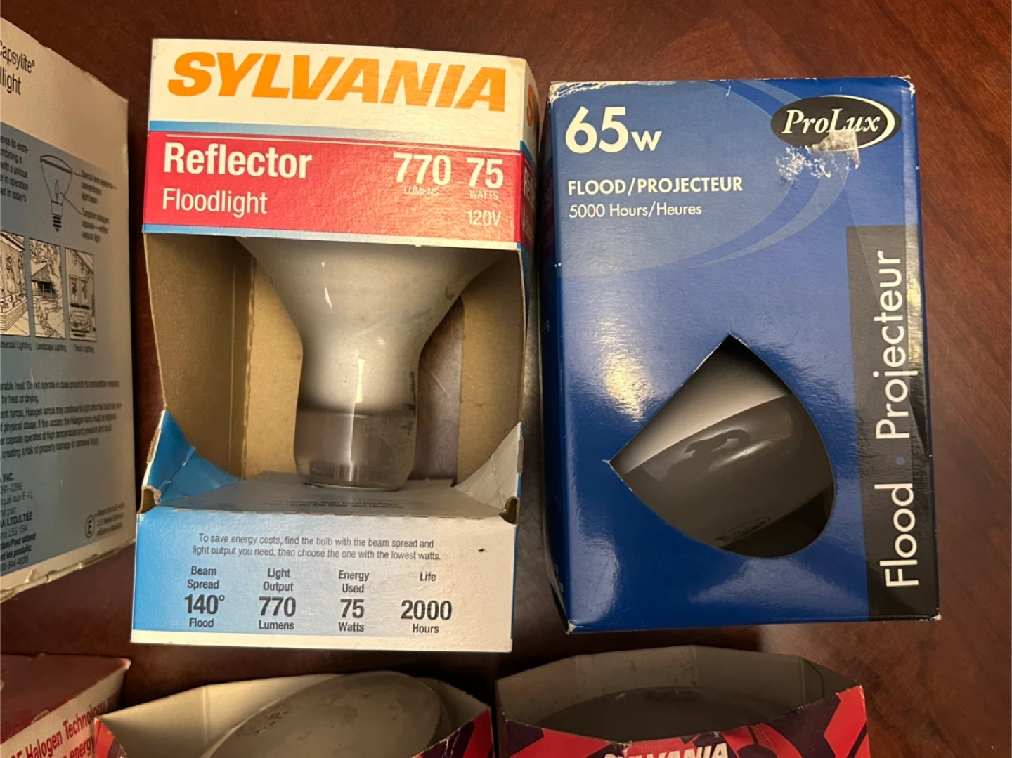Big lot flood light bulbs 65 & 75 watt Noma GE Sylvania lightbulbs cheap Donland O'Connor East York Cleaning out my father in laws garage and workshed 8 new boxed flood lights 2.00 each Buy all of them for 10.00 !!! Various brands etc see photos Flexible re pickup Elmsdale Road M4J 3M3 Donlands O'Connor East York Don Mills south exit off DVP