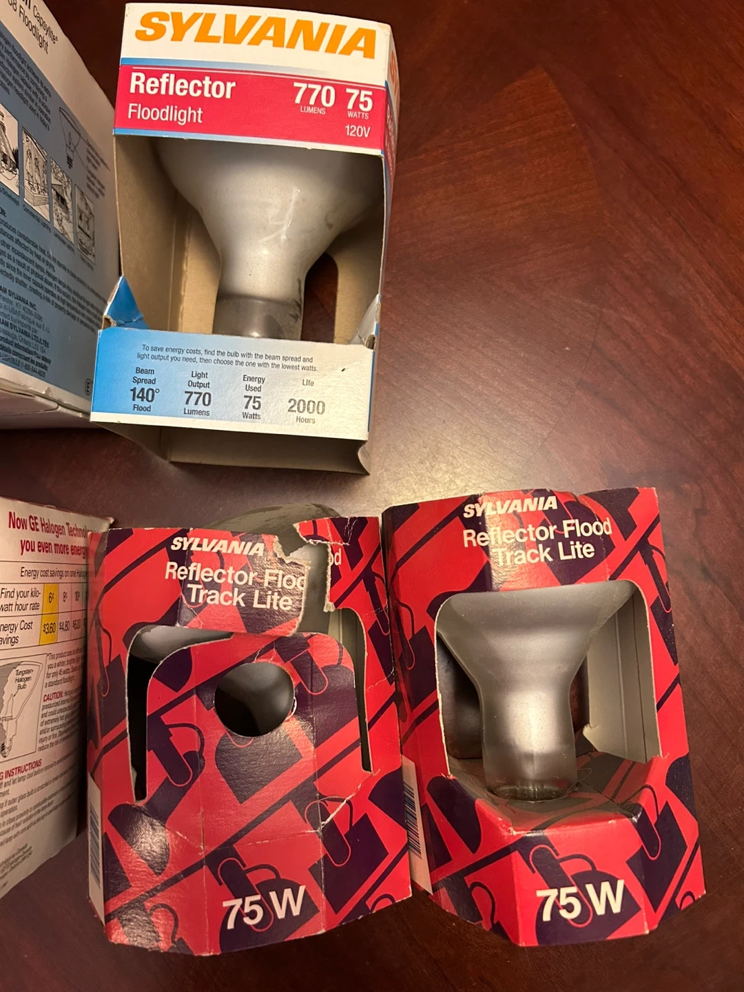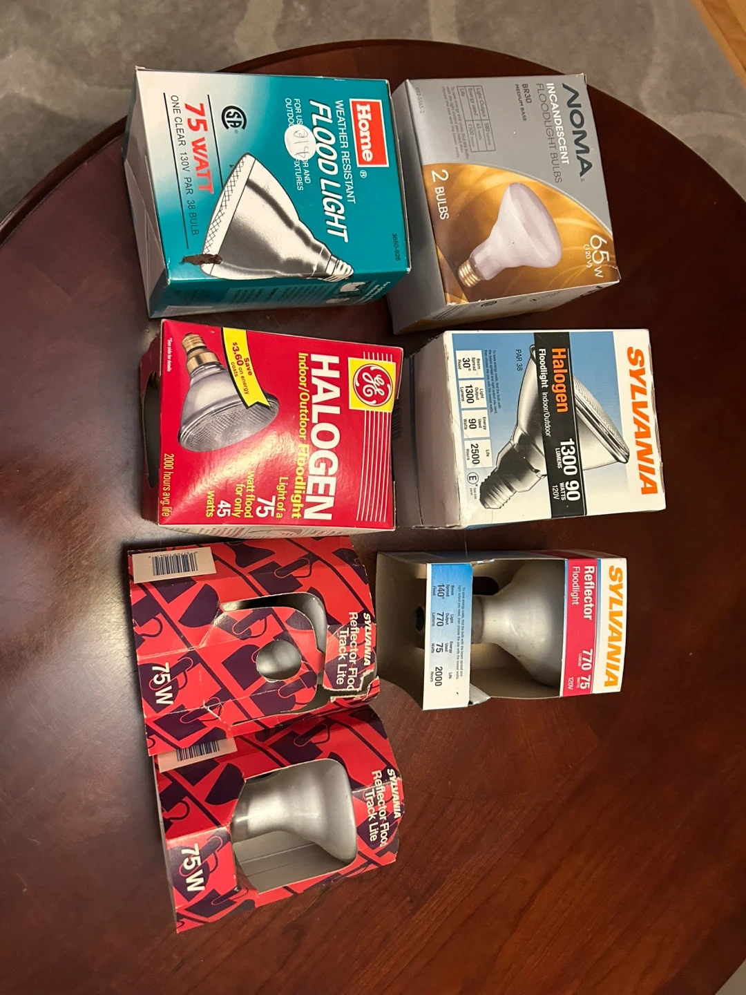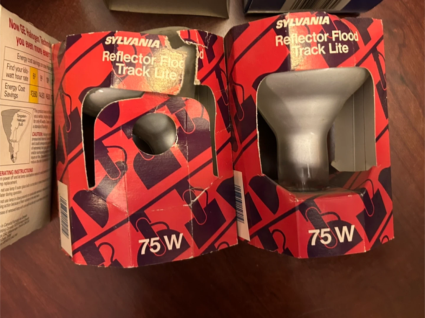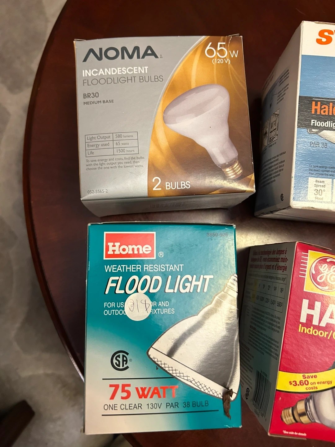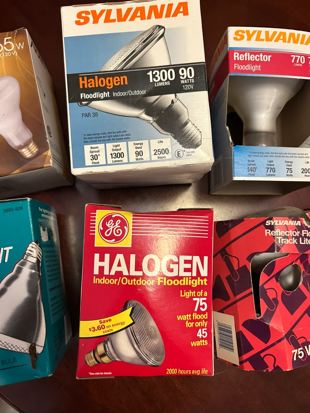 Big lot flood light bulbs 65 & 75 watt Noma GE Sylvania lightbulbs cheap Donland O'Connor East York Cleaning out my father in laws garage and workshed 8 new boxed flood lights 2.00 each Buy all of them for 10.00 !!! Various brands etc see photos Flexible re pickup Elmsdale Road M4J 3M3 Donlands O'Connor East York Don Mills south exit off DVP