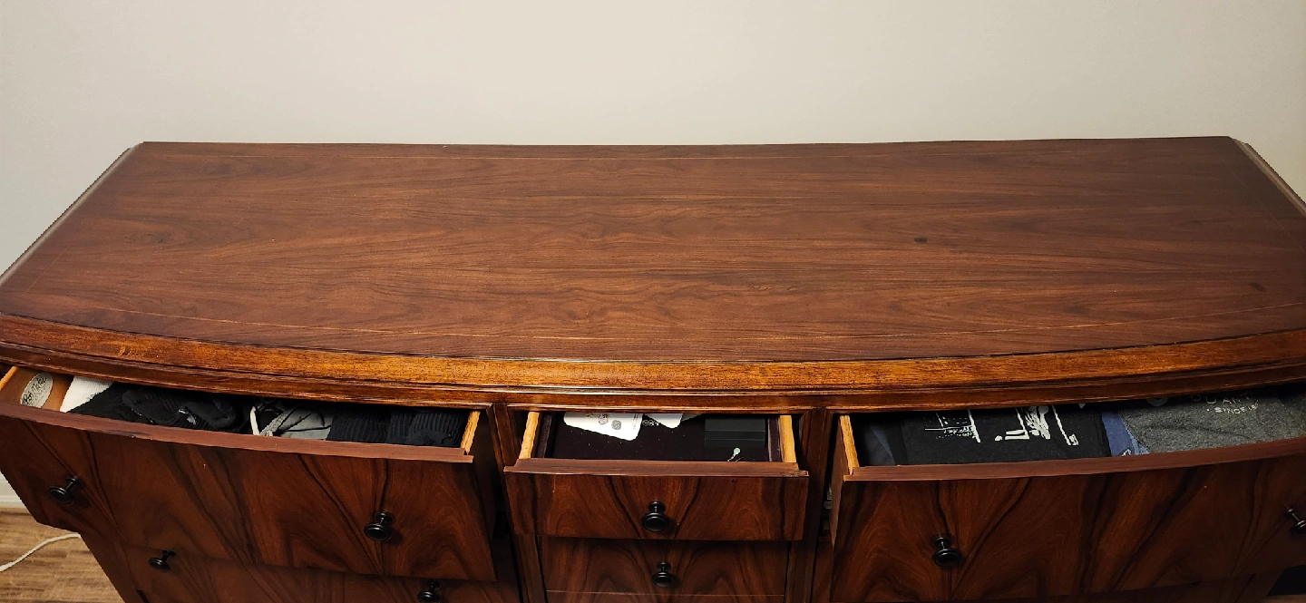 Bob Mackie Home by American Drew bedroom furniture in cherry mohogany for sale. Both pieces are in excellent condition. 10-drawer Dresser - $350 66" length x 20" deep x 39" height King Size Bed - $350 (mattress and box spring are not included) 86" length x 83" width x 72" height (backboard), 17 " height (on the sides of the frame) Was $3,500 retail. Pick up in Thornhill.