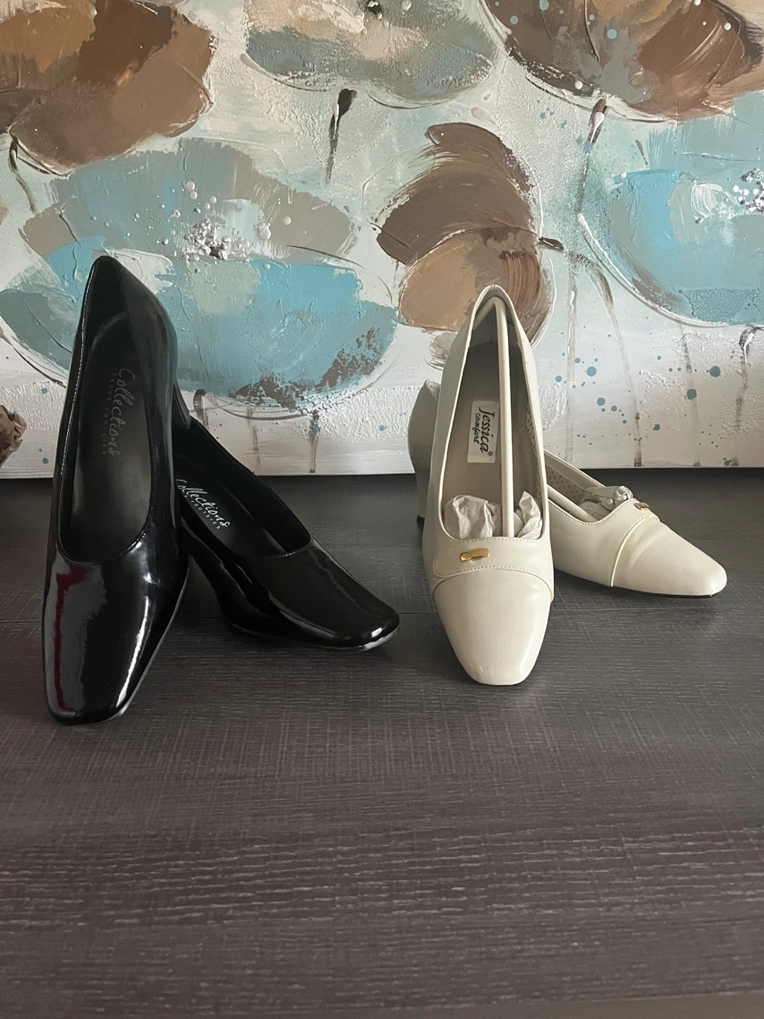Pick up in Utopia. Price is for both. Selling two pairs of gently used heels! One pair is from Collections Tender Tootsies in black patent leather, size 9.5W. The other pair is Jessica Comfort in bone, size 9B. Both come with their original boxes!