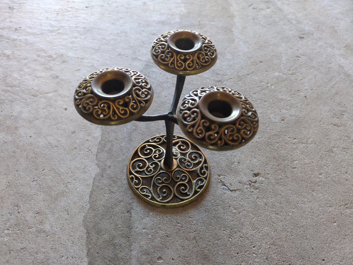 Selling a unique metal candlestick holder with an ornate design. It holds three candles and has a lovely decorative base. Perfect for adding a touch of elegance to your home!