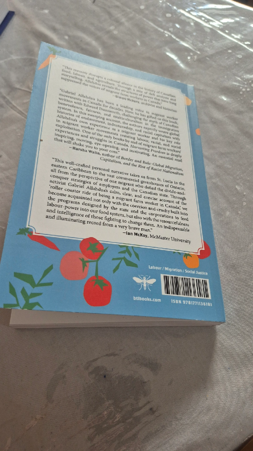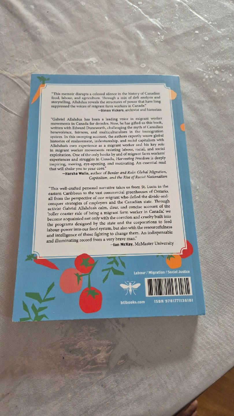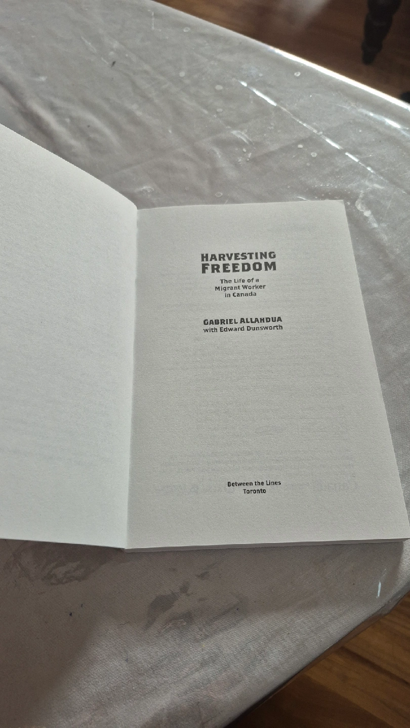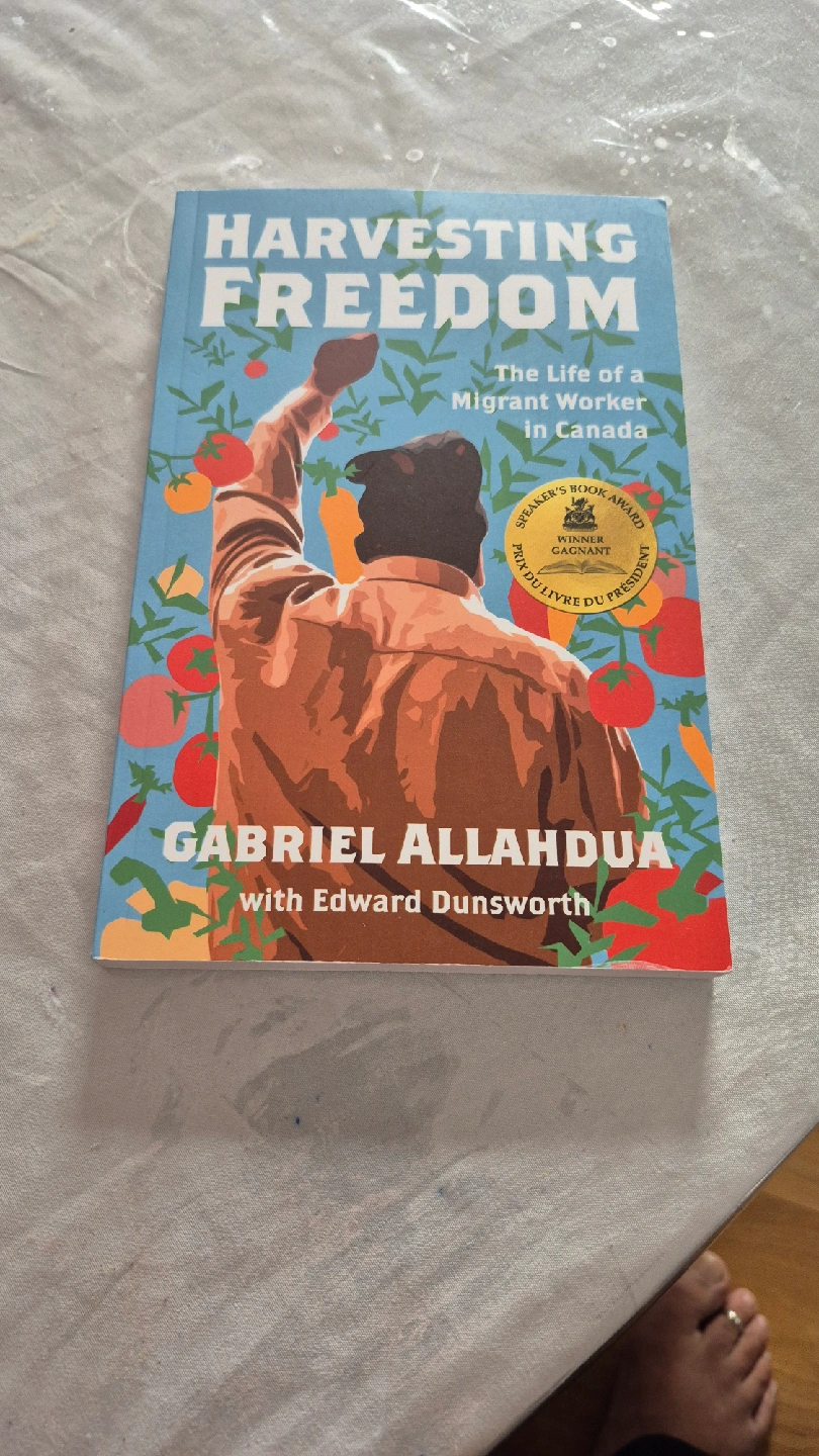 Selling a copy of "Harvesting Freedom: The Life of a Migrant Worker in Canada" by Gabriel Allahdua with Edward Dunsworth. It's a compelling read about labour, migration, and social justice in Canada. This book provides a deeply moving, eye-opening, and motivating perspective on the experiences and struggles of migrant workers. A must-read for anyone interested in Canadian history and social issues cash only please.