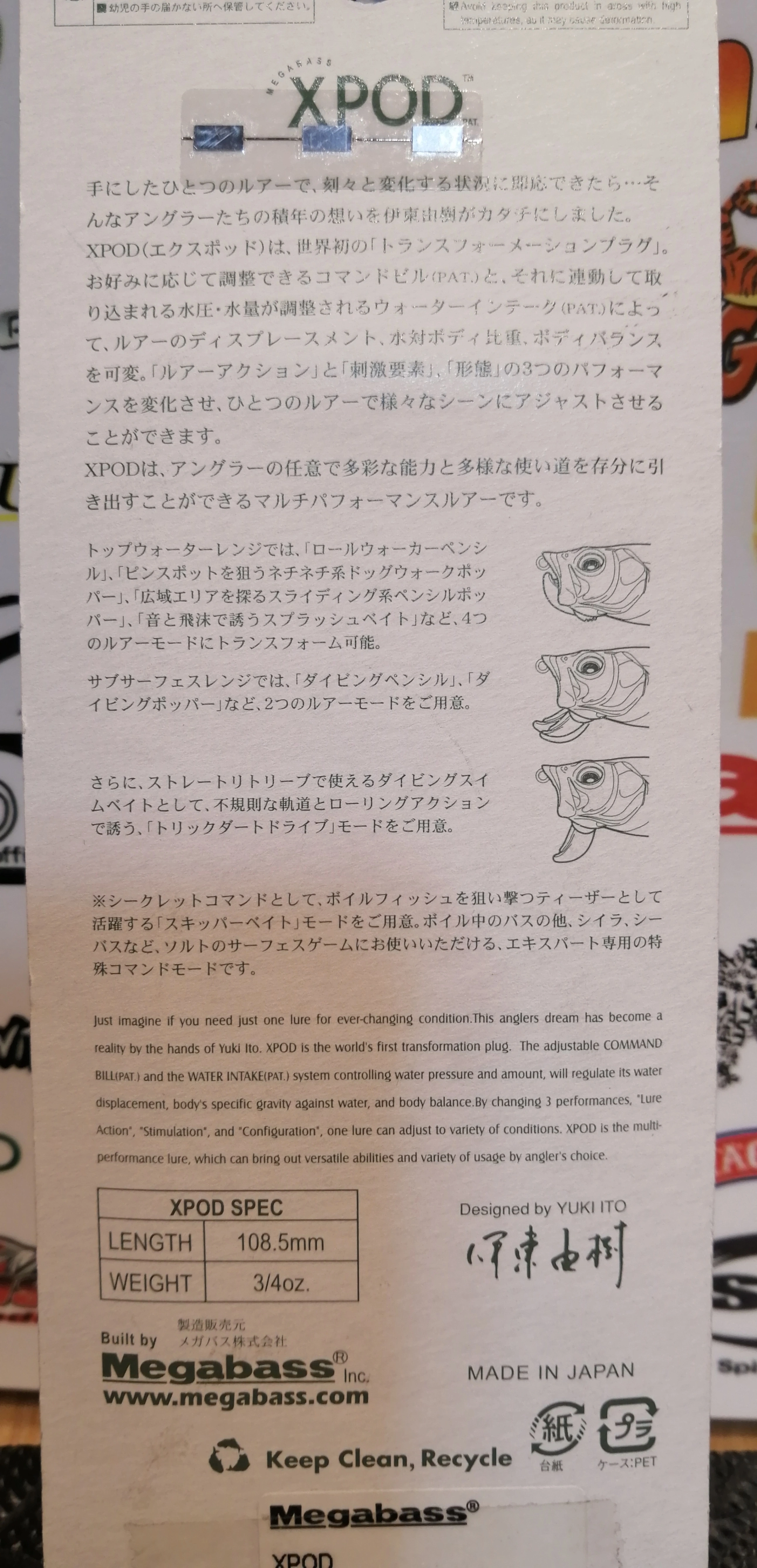 Located in OSHAWA ... Ritson Road North and Taunton Road area *** $60 (FIRM) EACH *** *** THIS BAIT HAS AN ADJUSTABLE BILL. NO OTHER BAIT ON THE MARKET HAS THIS FEATURE! *** BRAND NEW , RARE , JDM DISCONTINUED MODEL Megabass X-Pod Topwater Bait #1 - GLX ITO Gill ( JDM COLOUR ONLY AVAILABLE in JAPAN ) #2 - PM Bass ( JDM COLOUR ONLY AVAILABLE in JAPAN ) Weight: 3/4 oz Length: 4" Depth: Topwater Type: Floating Hook Size: #1/0 Just imagine if you need just one lure for ever-changing conditions. This anglers dream has become a reality by the hands of Yuki Ito. XPOD is the world's first transformation plug. The adjustable COMMAND BILL and the WATER INTAKE system controlling water pressure and amount, will regulate its water displacement, body's specific gravity against water, and body balance. By changing 3 performances, "Lure Action", "Stimulation", and "Configuration", one lure can adjust to variety of conditions. (shown on back of packaging) XPOD is the multi-performance lure which can bring out versatile abilities and variety of usage by angler's choice, cast & retrieve. YouTube Video: https://www.youtube.com/watch?v=KkKFKhYAYBs