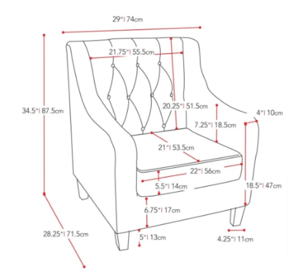 Comfortable armchair in a neutral brown tone, perfect for any living space. It's like new Dimensions: - Width: 29 inches / 74 cm - Height: 34.5 inches / 87.5 cm - Seat depth: 22 inches / 56 cm It features a classic button-tufted back and a sturdy build Near Yonge and Sheppard