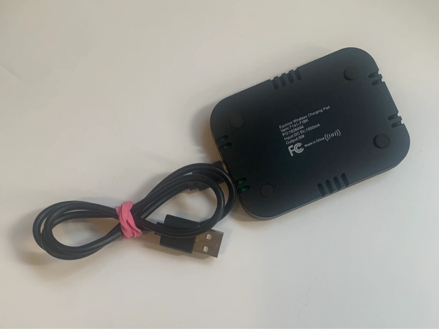 Wireless charging pad. It's ready to keep your devices powered up! It outputs 5W and comes with the charging cable