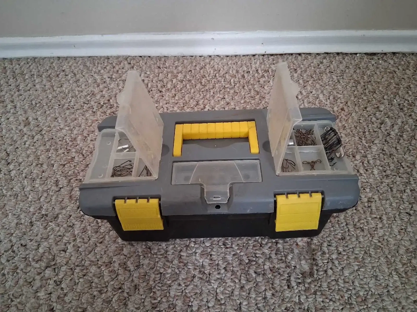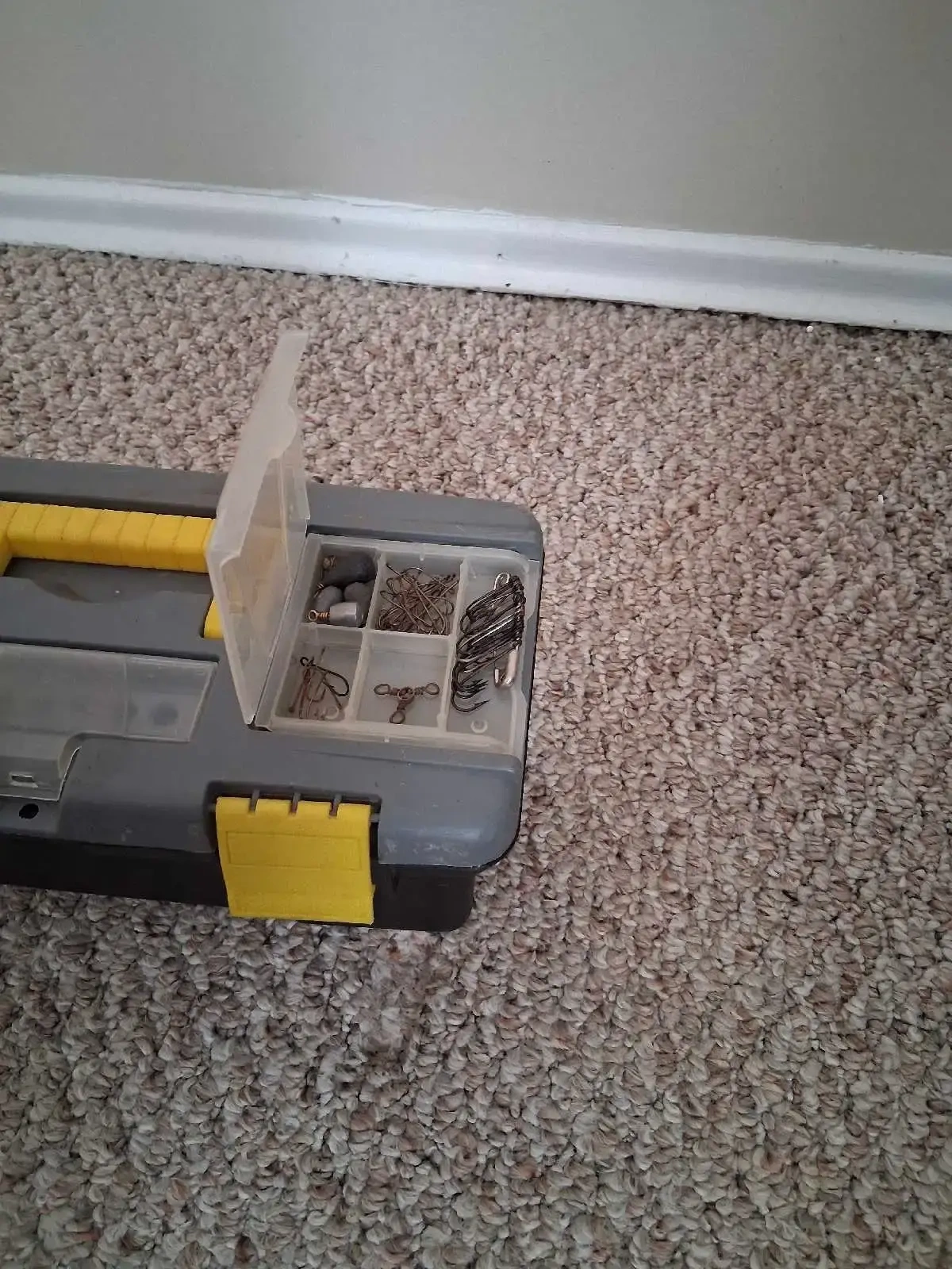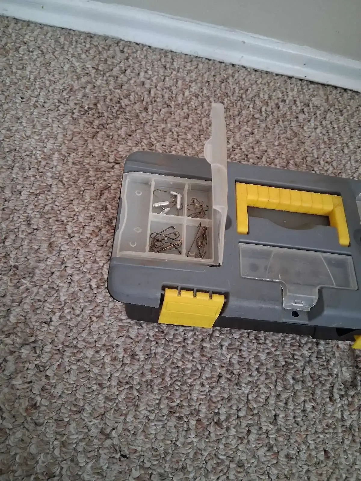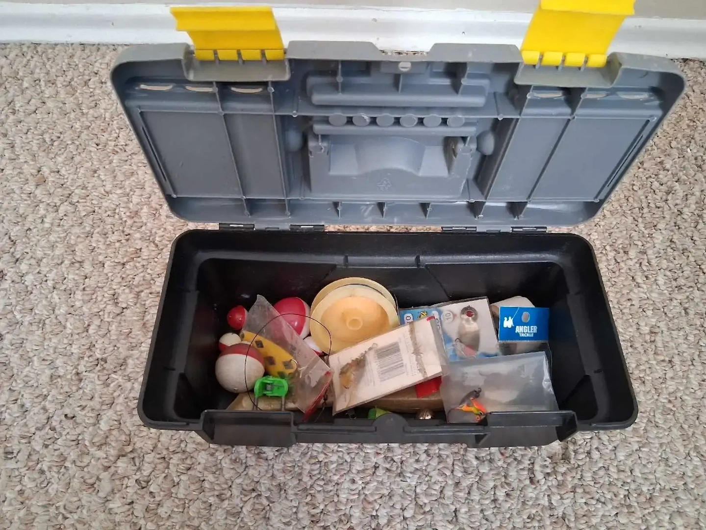 This Angler fishing tackle box comes equipped with an assortment of hooks, bobbers, weights, and line, ready for your next fishing adventure. * Assorted Hooks * Bobbers * Weights * Fishing Line Don't let this one get away!