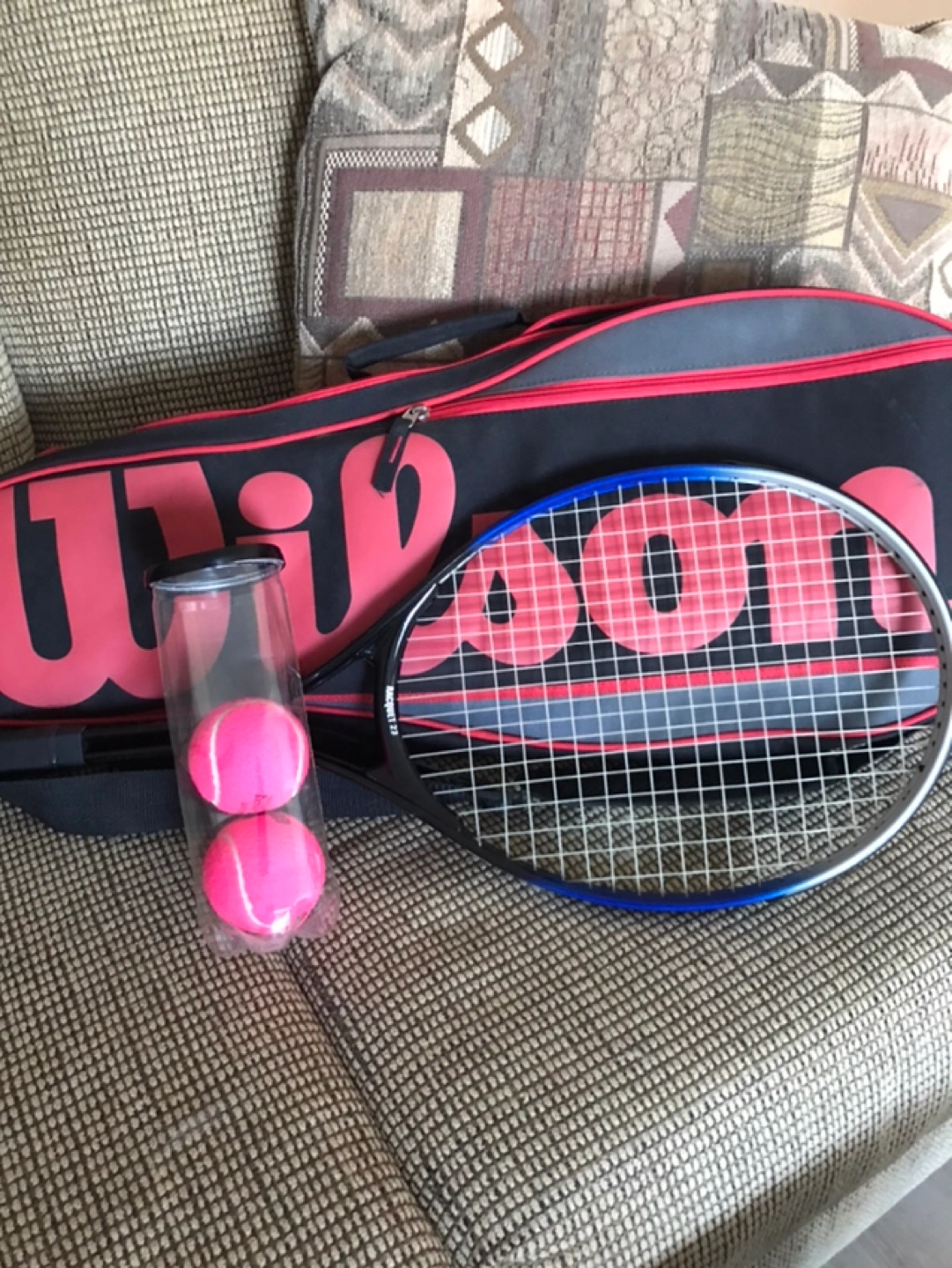 Selling a tennis racquet with a Wilson bag and 2 pink tennis balls. Great for beginners or anyone looking to upgrade their gear!