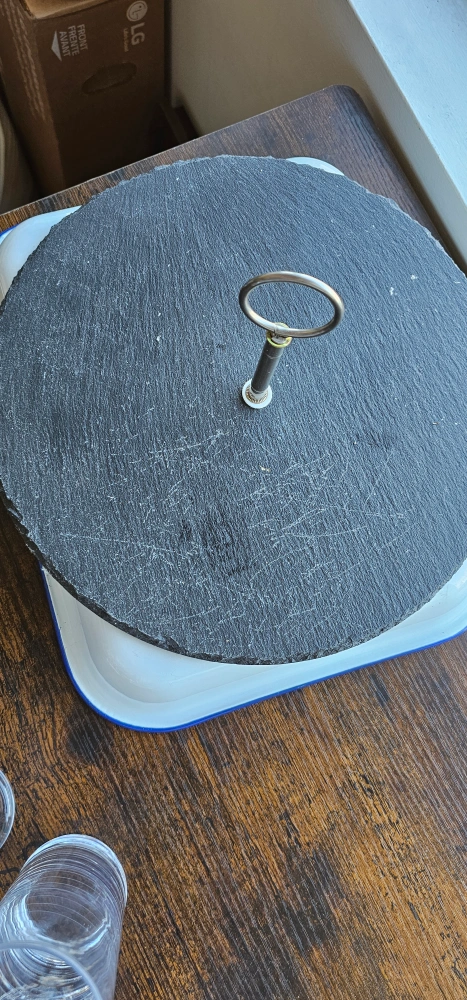 Selling a slate cake stand. It has a handle in the middle. It's in used condition with some scratches on the surface. brand new used once