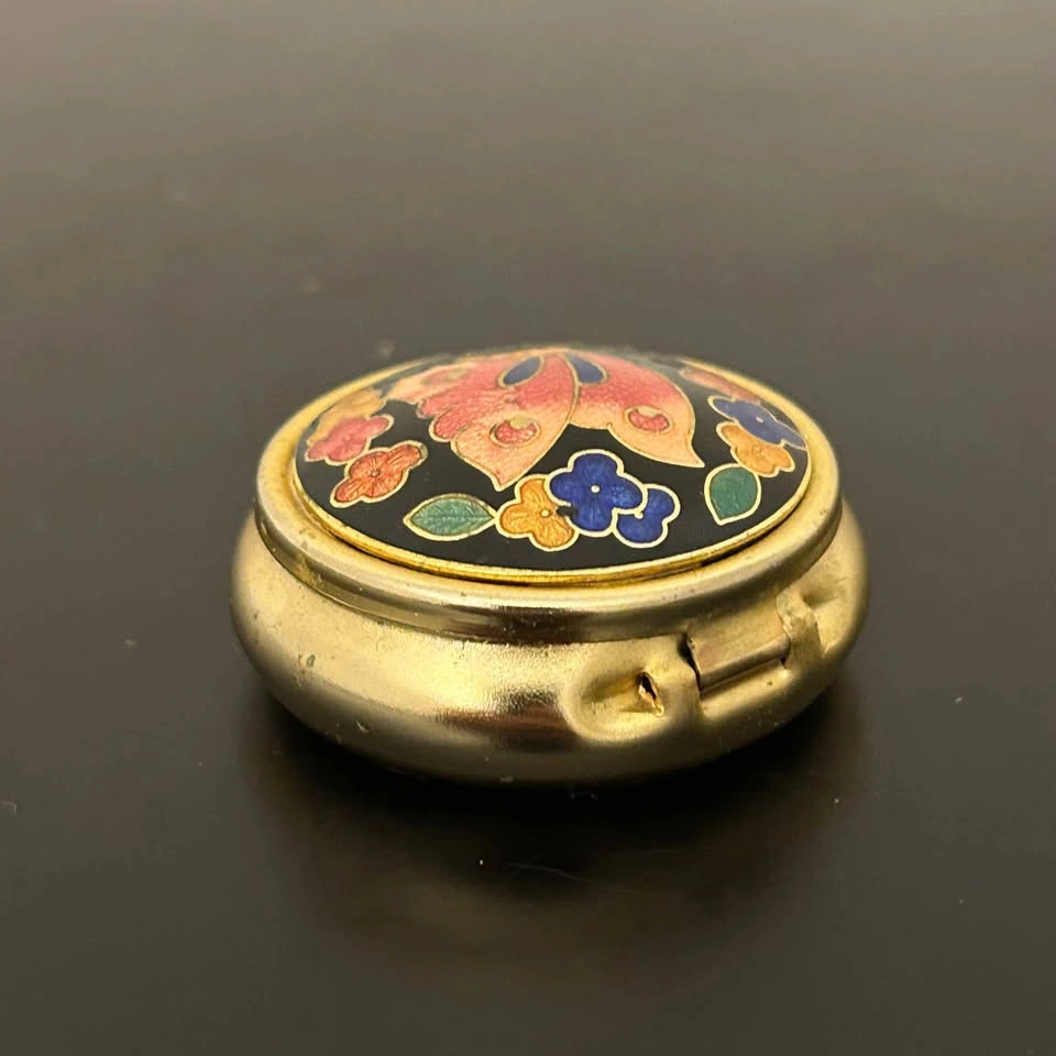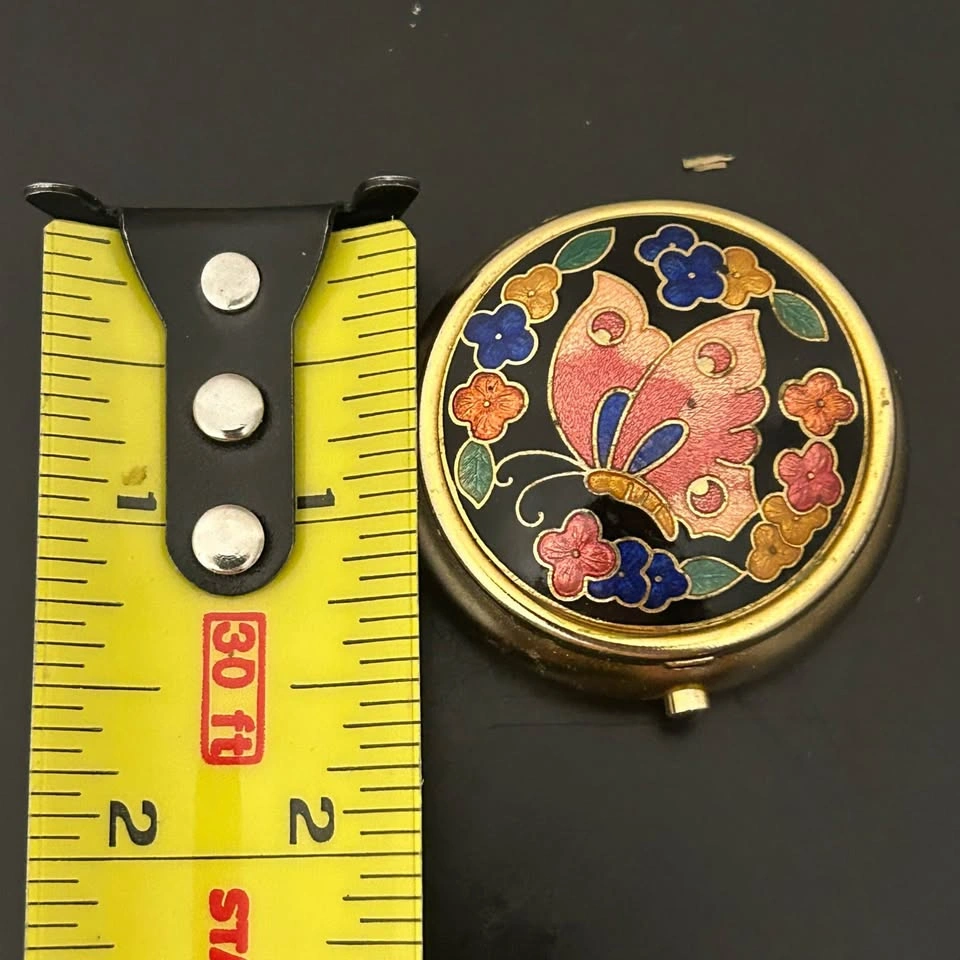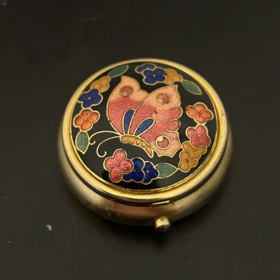 Charming vintage cloisonné enamel pill box featuring a pink butterfly surrounded by colorful flowers on a black background. Made of brass with fine hand-enameled detailing and an inner plastic liner. Compact and decorative — ideal for storing small jewelry, pills, or as a collectible display piece. Diameter about 1.5 inches. Good vintage condition with light patina and minor age wear. Pick up in the Seton area, Calgary. See also my other lots. Open to your questions and suggestions. If necessary, I provide additional photos. These are not new things, so please look carefully at the photos and videos. Sizes are submitted on request and also using a tape measure in the photo.