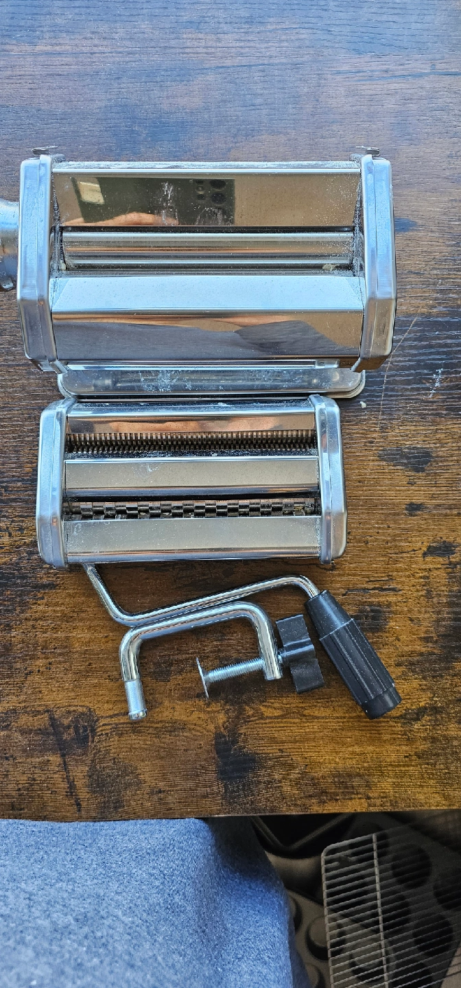 Selling a vintage pasta maker! It's in good condition and ready to help you make some delicious homemade pasta. Includes the cutter, main body, and clamp. only used once