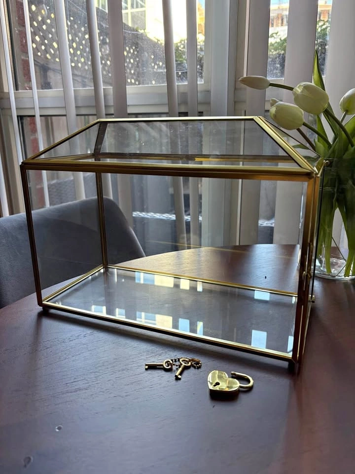Glass money box (with slot at the top). Opens on the side, with a heart shaped lock and keys for security. Really beautiful and great for weddings, celebrations, etc. could even be used as a terrarium/small greenhouse. Cash only and pickup only near Yonge & Davisville.