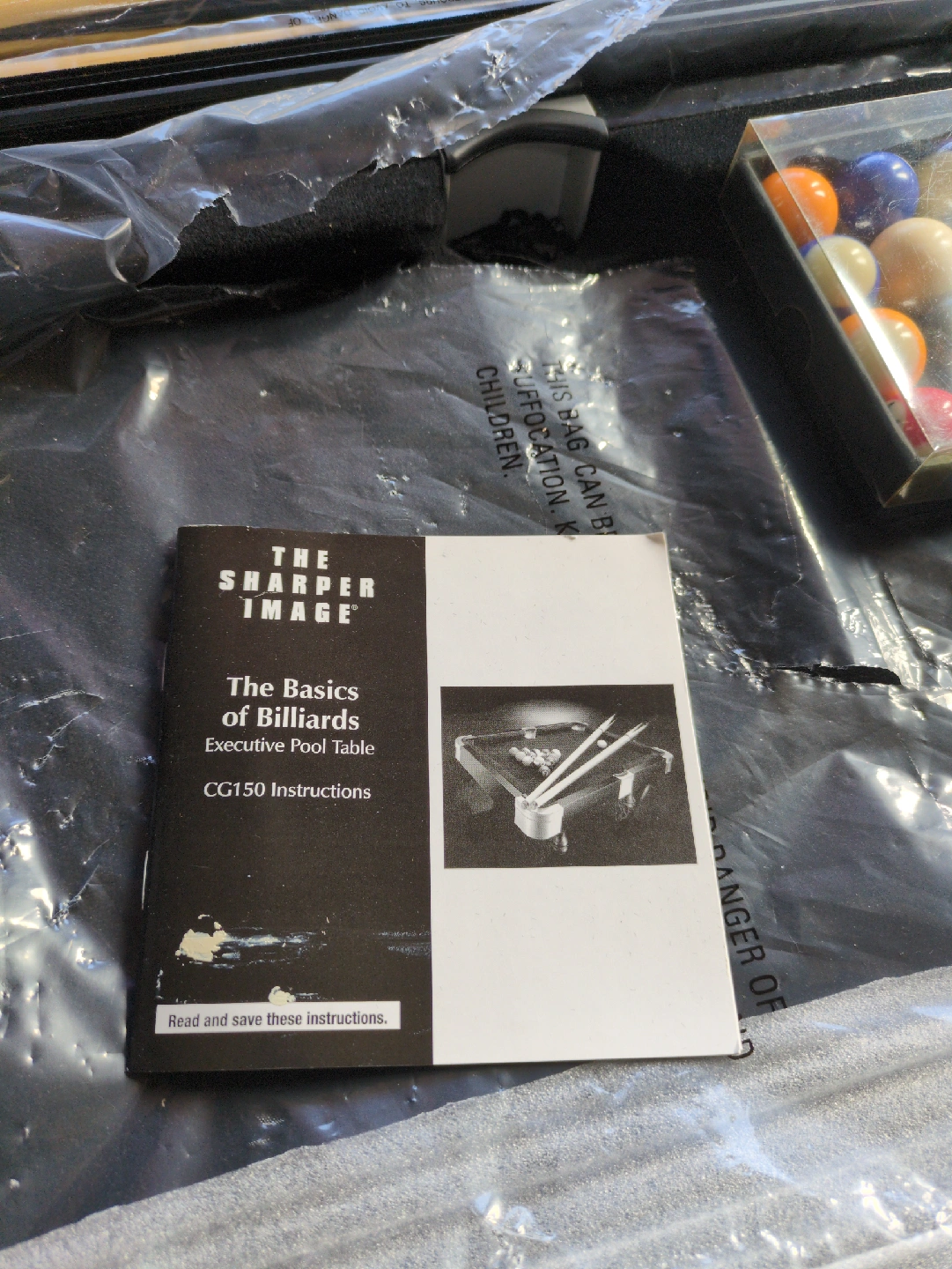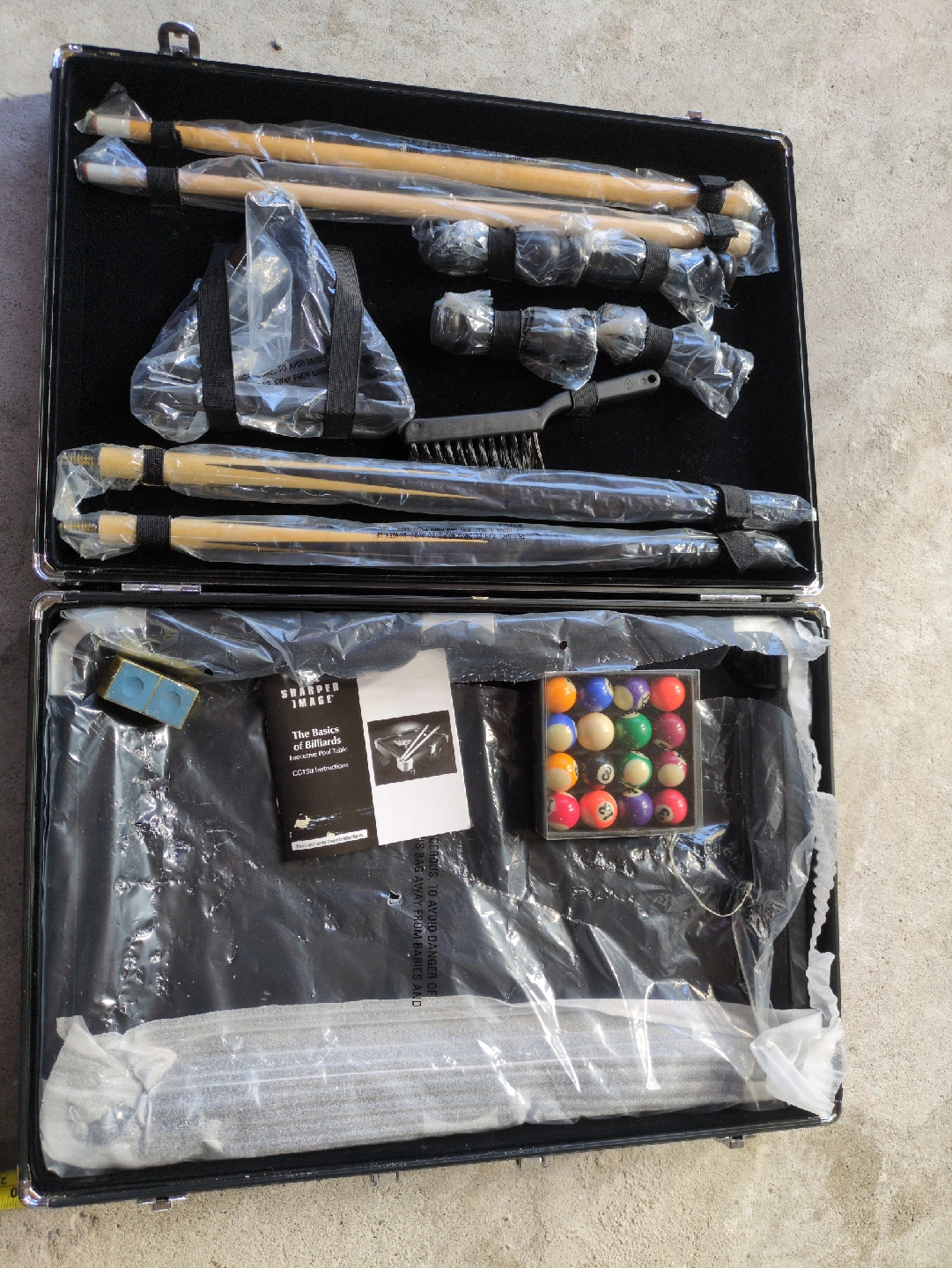 Selling a brand new Sharper Image Executive Pool Table set! It includes all the essentials for a fun game of billiards. The set comes in a carrying case, perfect for storage or taking the game on the go. Includes the instruction manual.