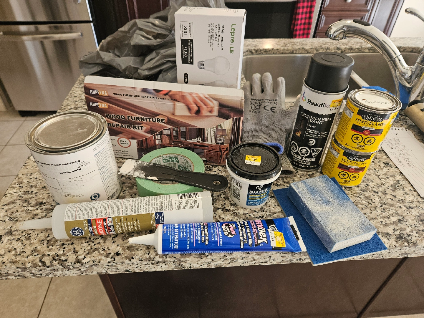Selling a variety of home repair items! Included are: NO high heat paint or light bulbs. - HUPEYNA Wood Furniture Repair Kit - Minwax Teinture a Bois (2 cans) - DAP Alex Plus caulk - GE Silicone - Rydex spackle - Sanding sponges and gloves Perfect for your next DIY project!