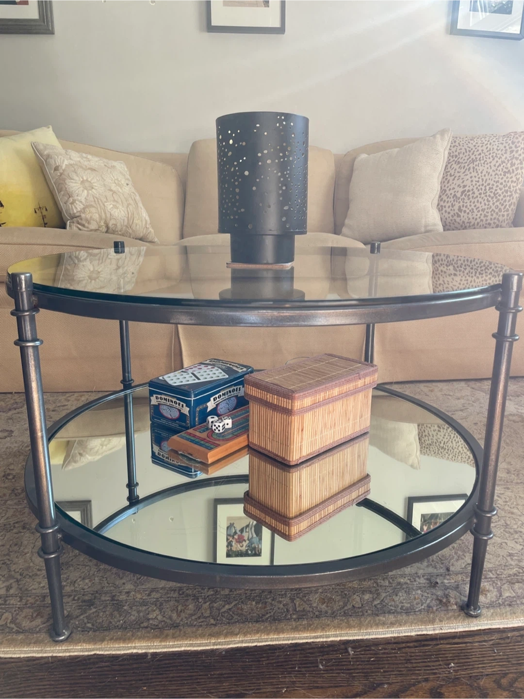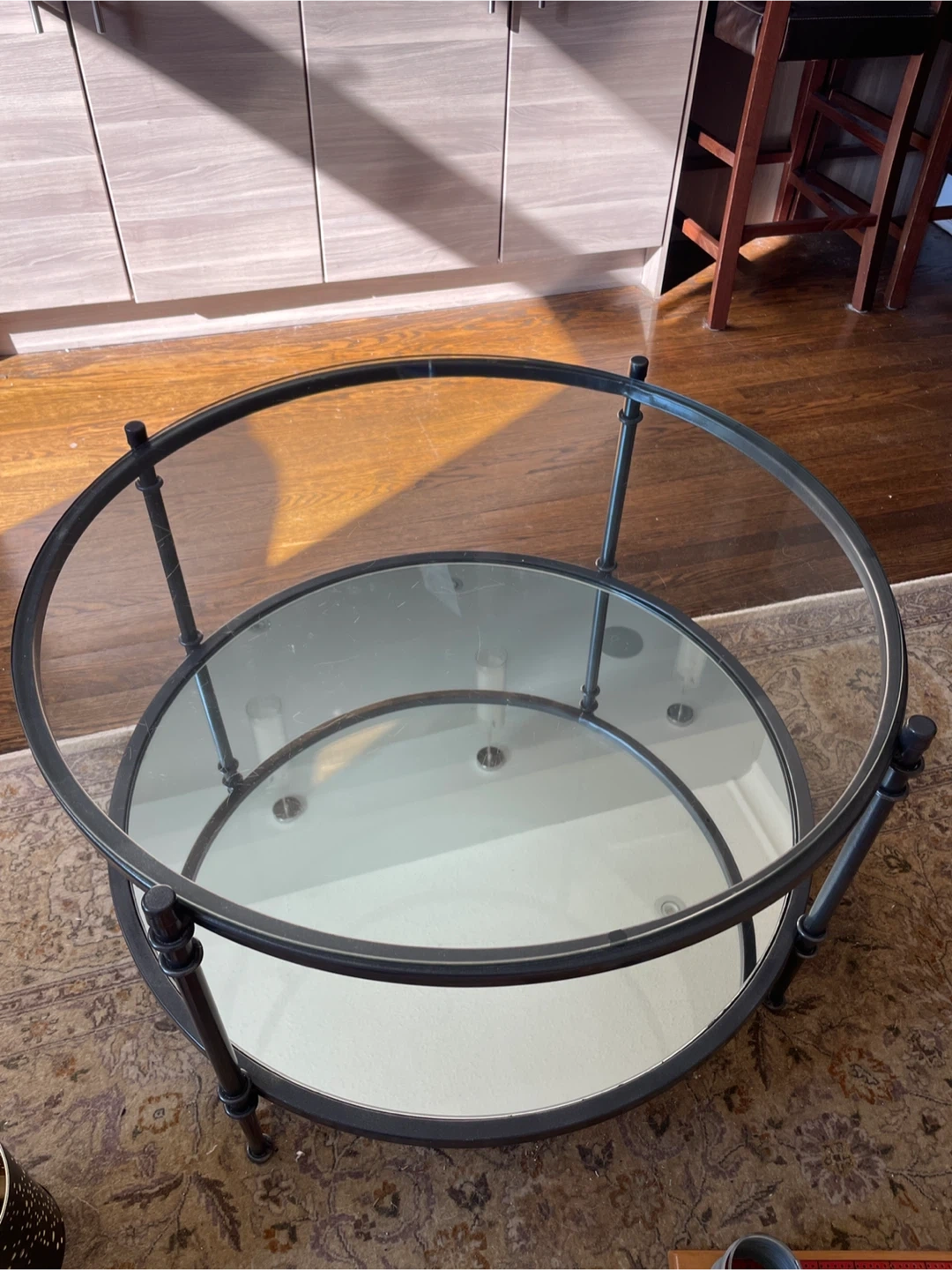 I'm offering a set of glass coffee and end tables with a sleek design that enhances any living space. The tables feature a durable metal frame with a glass top and a mirrored bottom shelf, ideal for displaying decor or storing items. These tables are previously owned but are still in great shape. * Sturdy metal frame * Glass top surface * Mirrored bottom shelf
