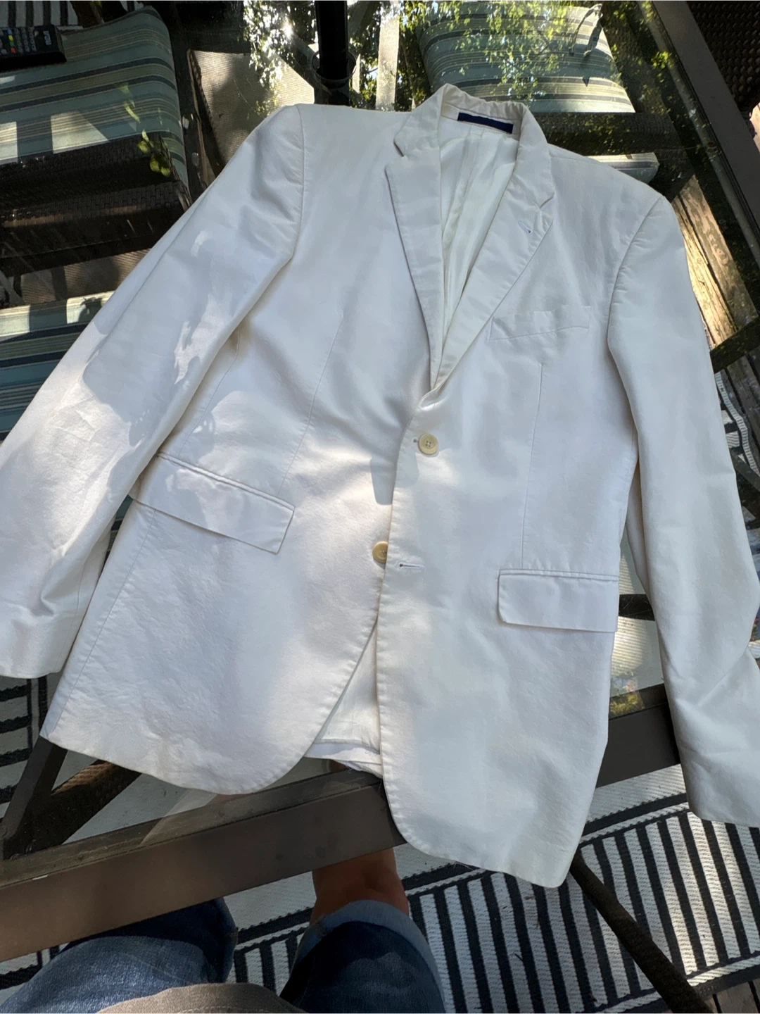 Selling a Hickey Freeman blazer in white. It’s in great condition and ready for a new home! The jacket is perfect for a stylish, clean look.