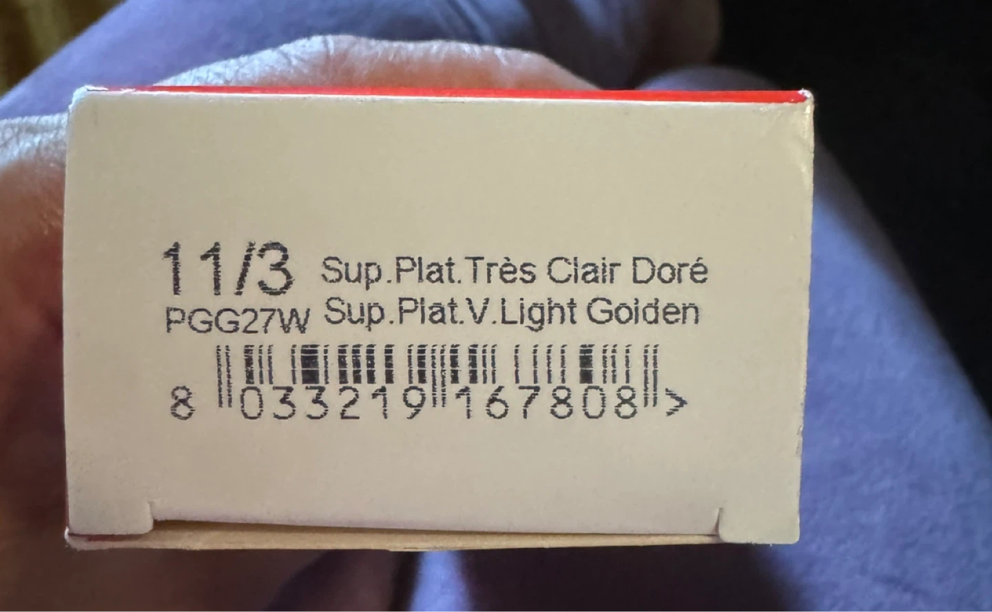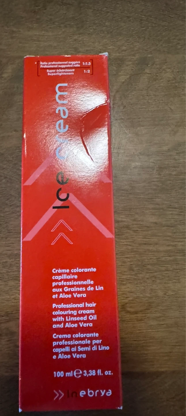 I'm selling Inebrya Ice Cream professional hair colouring cream with linseed oil and aloe vera. The colour is 11/3 Sup. Plat. Très Clair Doré. It comes in a 100 ml / 3.38 fl oz box
