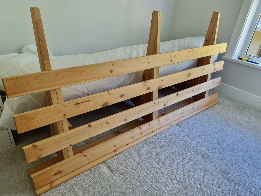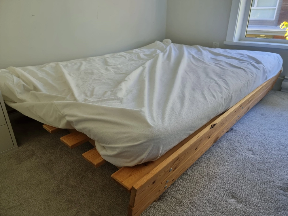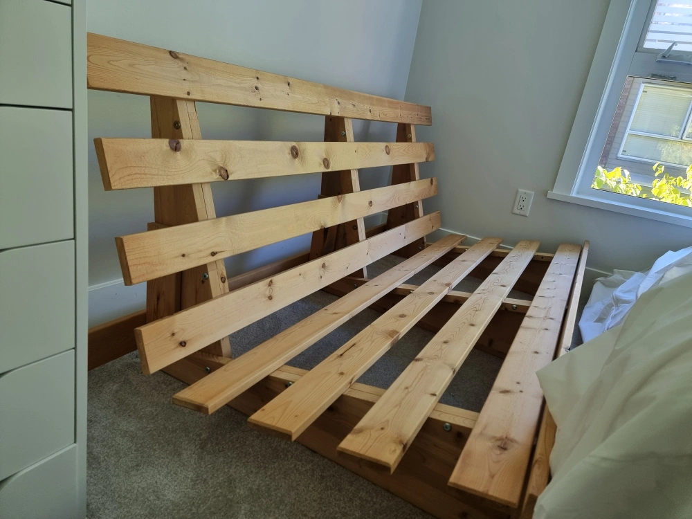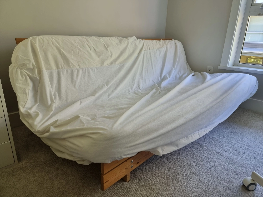Approx. Queen size Futon with mattress and mattress cover that can be turned into a sofa-bed that can comfortably sleep 2 people. Easily collapses by untightening 3 bolts with an Allen key. Pick-up only.